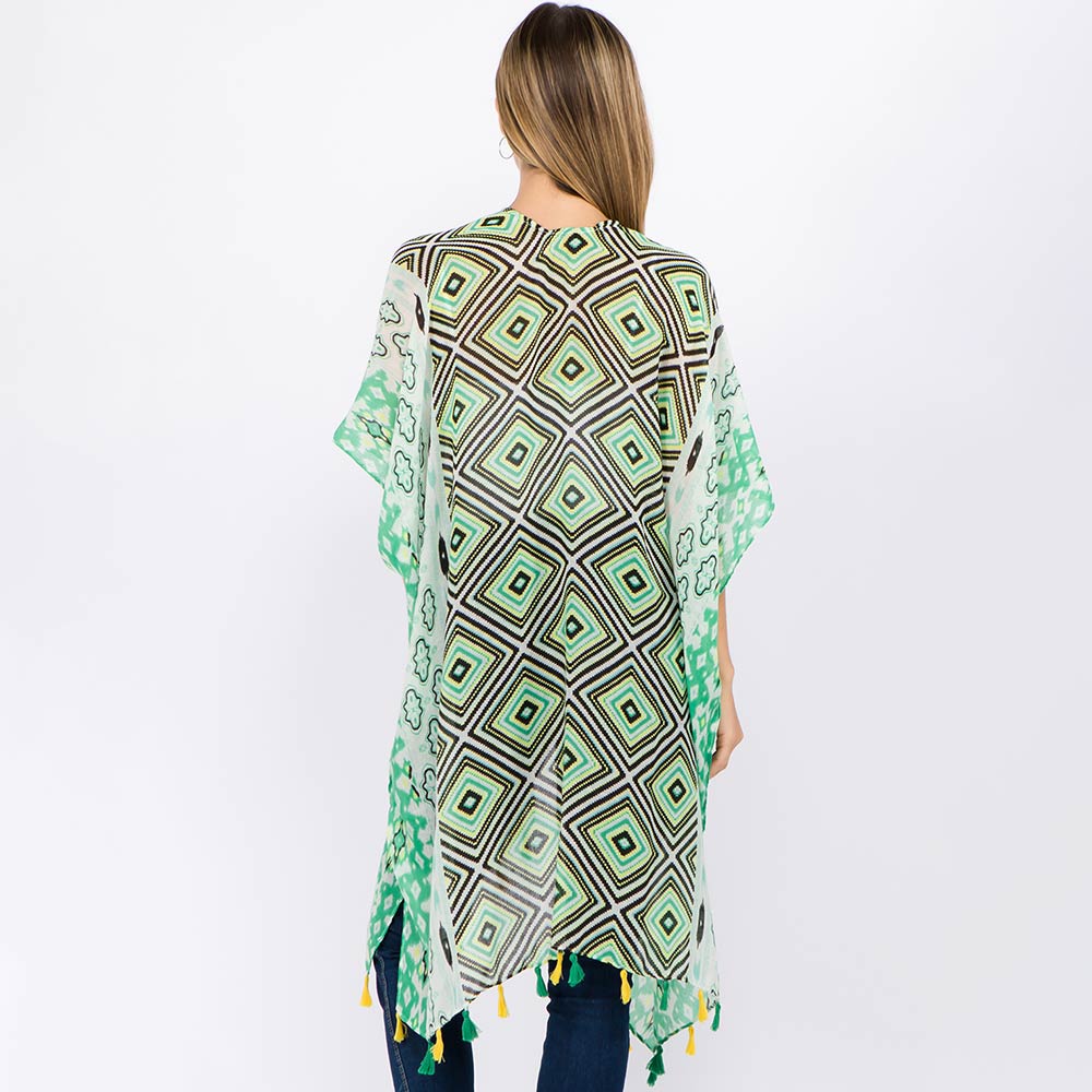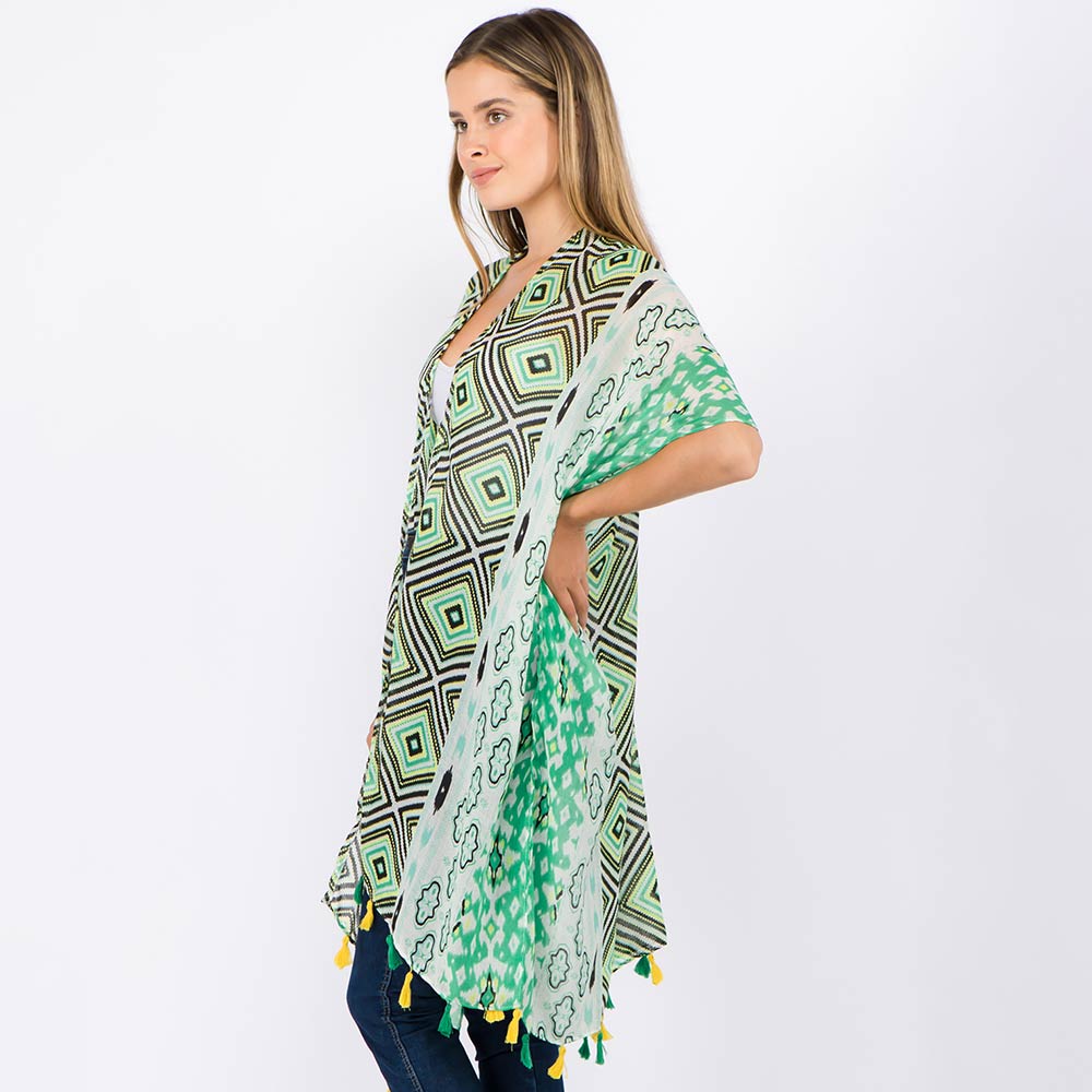 • Statement kimono cover up featuring an eye-catching geometric pattern and flowing open-front design. Finished with tassel accents for added movement, this versatile layering piece is ideal for boutique displays, resort wear edits, and effortless styling from casual outings to vacation looks.