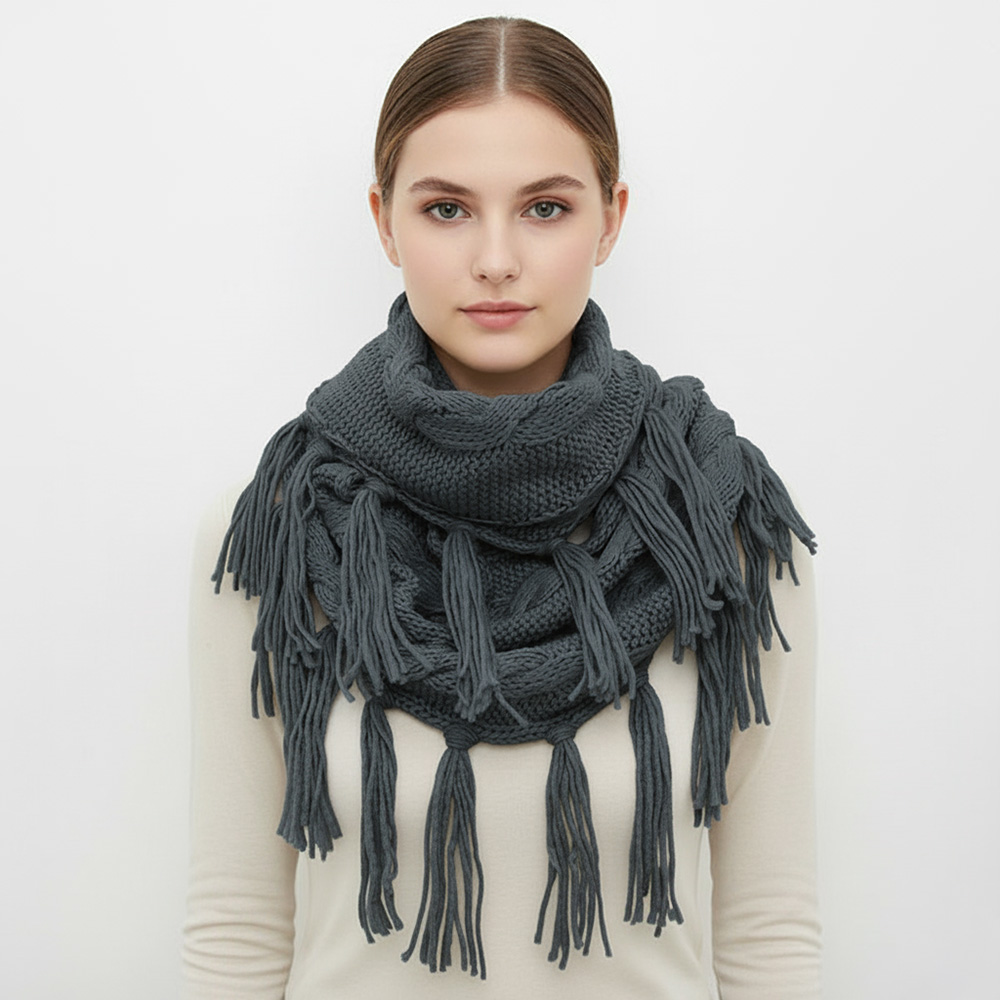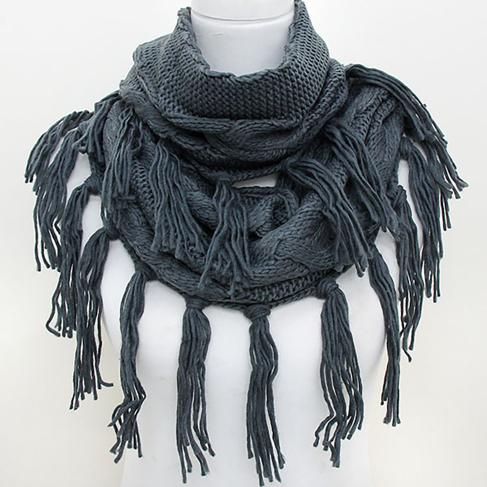 Details • Size : 14" X 60" • Material : 100% Acrylic • Wrap yourself in cozy comfort with this chunky knit infinity scarf featuring long tassel fringe. Its thick texture and draped design provide warmth and modern flair, making it an ideal accessory for elevating cold-weather looks with effortless sophistication.