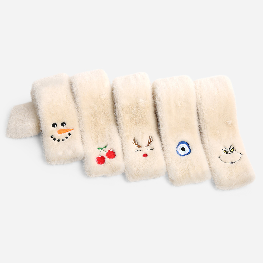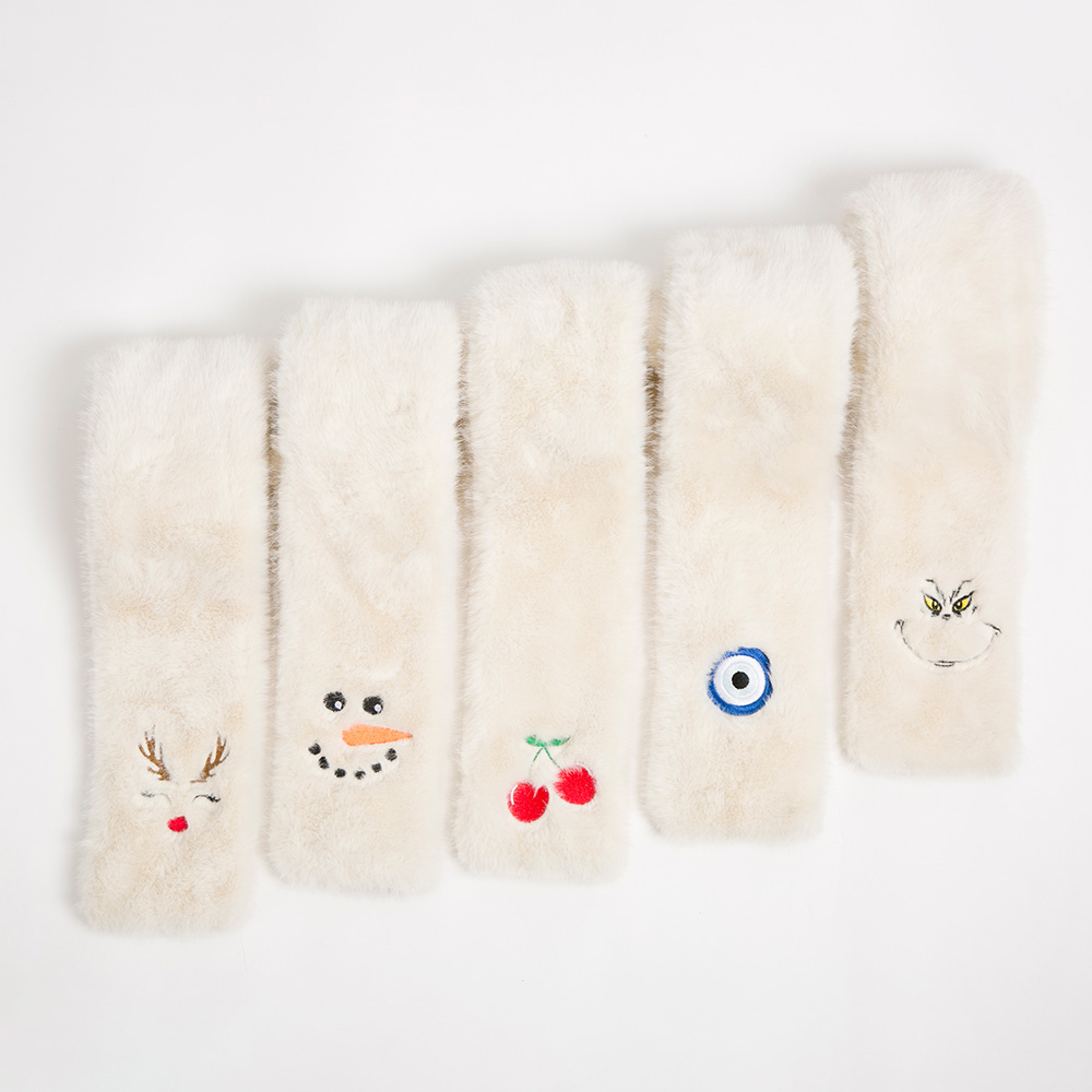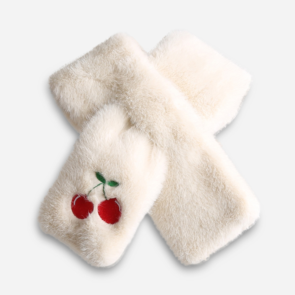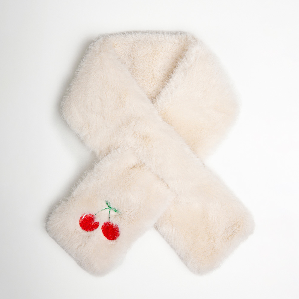 Details • Size : 4" X 34" • Cherry Embroidered Faux Fur Scarf – Soft, cozy winter scarf with charming cherry detail. Adds playful elegance to your cold-weather look while keeping you warm and stylish. Perfect for festive outfits or everyday wear.