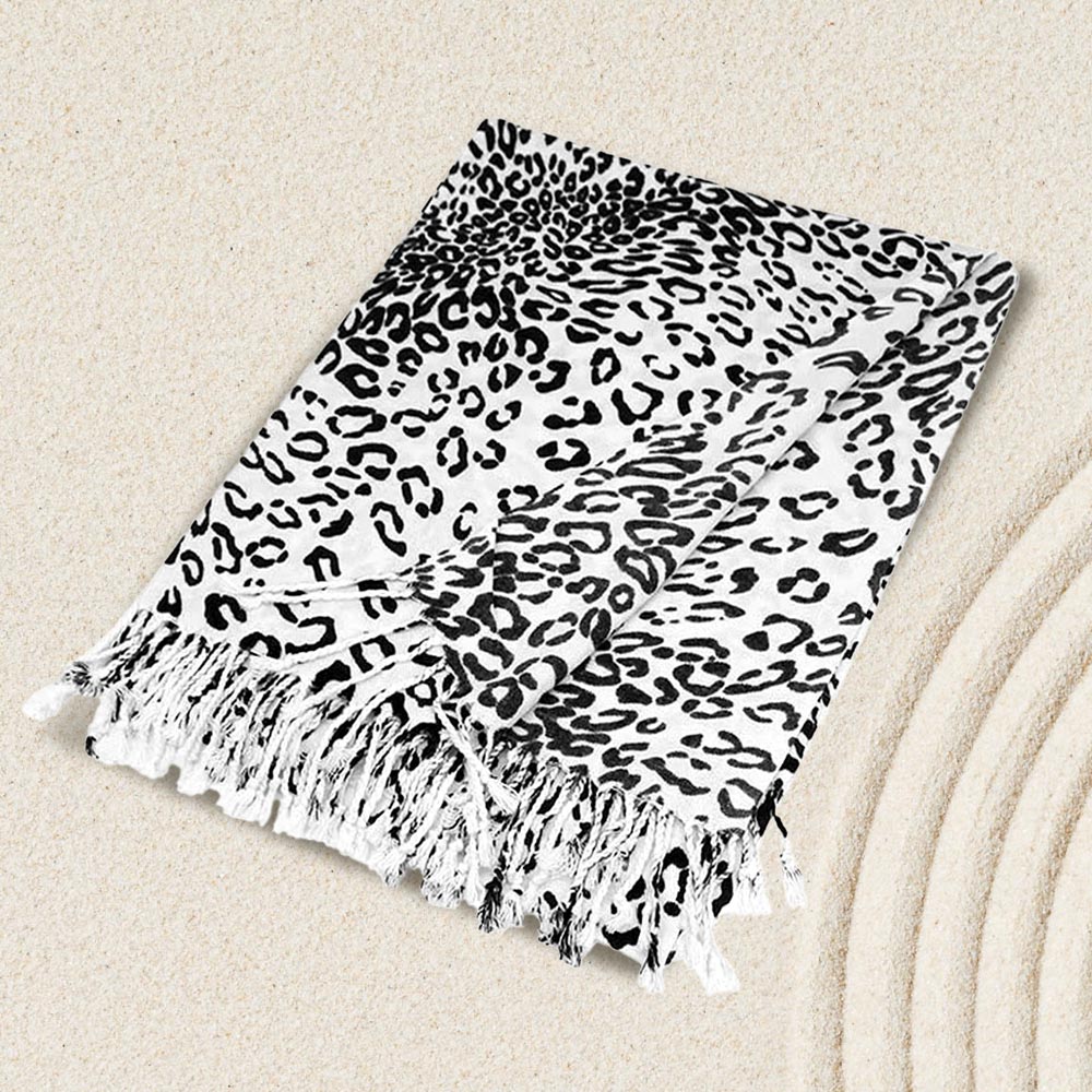 Details • Size : 28" X 78" • Material : 100% Acrylic • Leopard print fringed scarf designed for versatile styling and comfort. Lightweight yet cozy, this animal print wrap adds a bold accent to casual or dressy looks, perfect for layering in any season. Finished with tassel edges for added texture and effortless chic appeal.