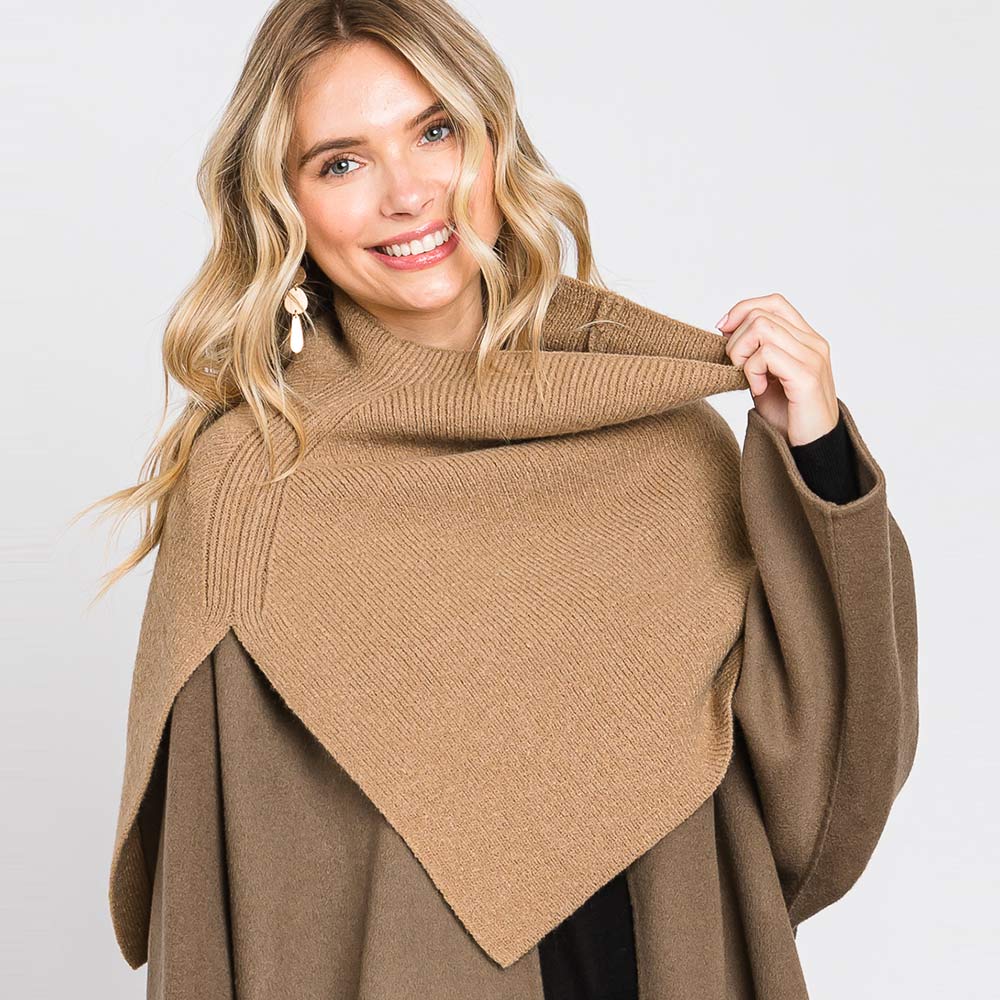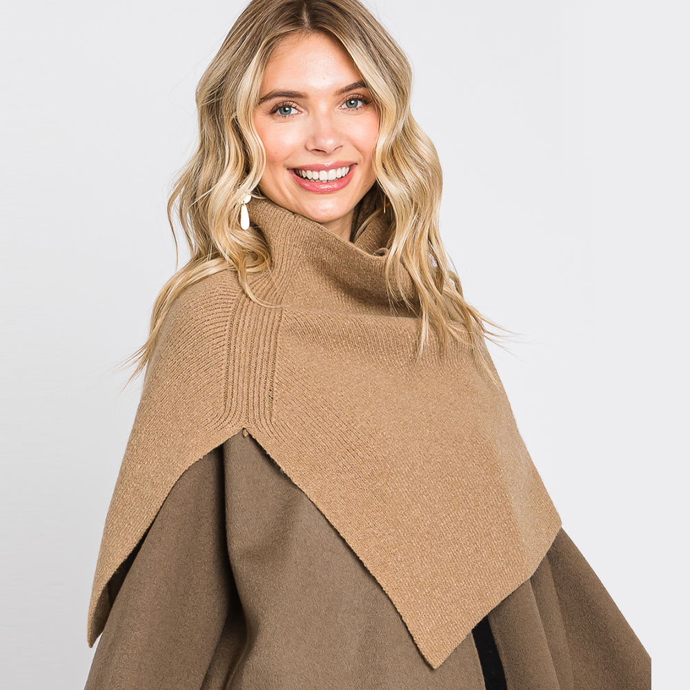 Details • Size : 19.25" X 19" • Material : 50% Acrylic, 28% Polyester, 22% Spandex • Chic asymmetrical knit turtleneck shoulder wrap offering cozy warmth and modern elegance. Perfect for layering over coats or sweaters, this stylish piece adds texture and sophistication to your outfit, making it an effortless statement accessory for cool-weather looks.