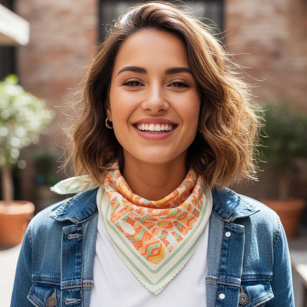 • Modern square fashion scarf featuring a playful abstract animal-inspired pattern with bold graphic movement. Designed for versatile styling on the neck, hair, wrist, or handbag, this statement accessory adds artistic character to everyday outfits, seasonal collections, and boutique fashion displays.