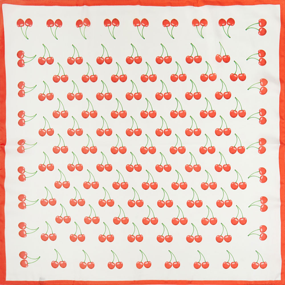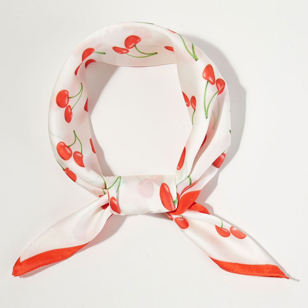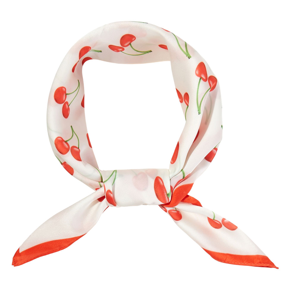 Details • Size : 27.5" X 27.5" • Material : 100% Polyester • Add a sweet touch to any outfit with this cherry print square scarf featuring vibrant red cherries, fresh green stems, and a bold red border. Perfect as a neck scarf, hair tie, handbag accessory, or bandana for a fun and playful look. Lightweight and stylish, this fruity fashion piece brightens casual and summer outfits with charming detail.