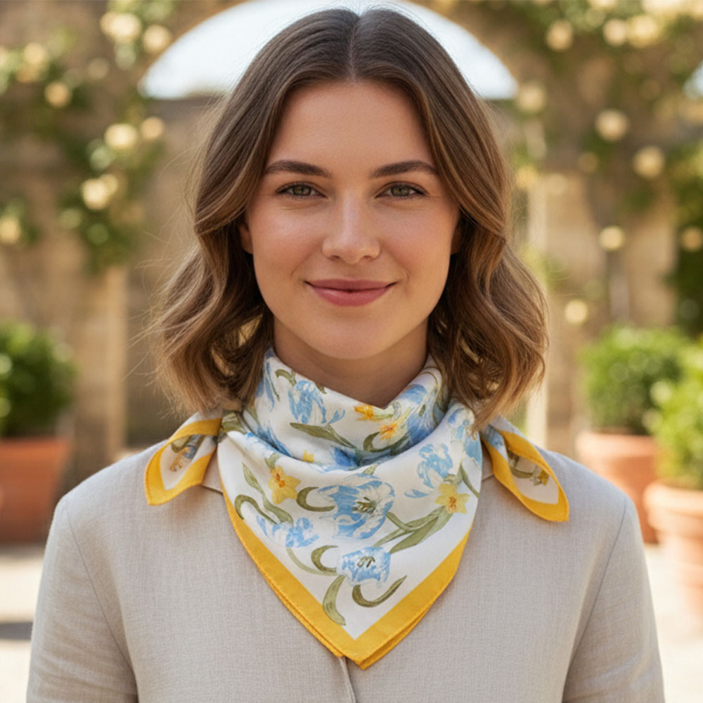 • Add a refined touch to your wardrobe with this beautifully patterned square scarf featuring an intricate floral design. Its versatile layout complements casual and dressy looks, perfect for wearing around the neck, in the hair, or tied to a handbag for effortless sophistication.
