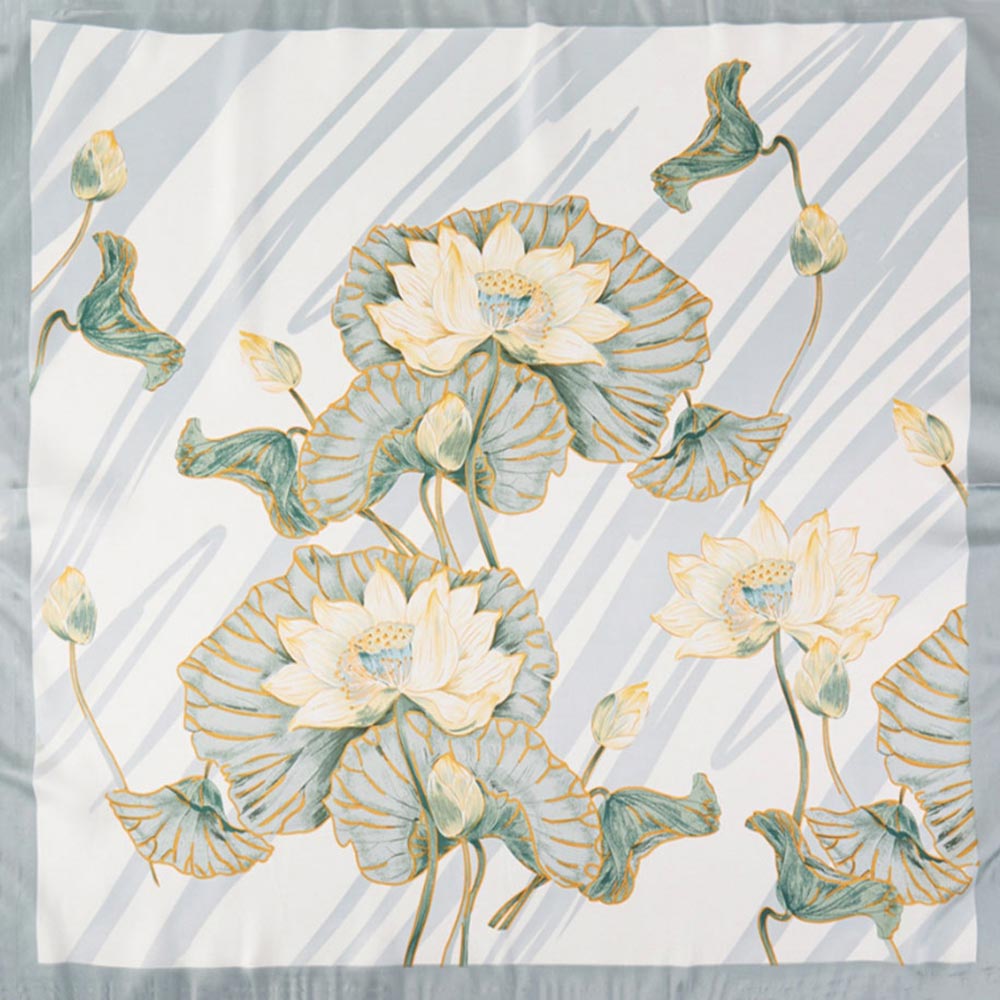 • Bring tranquil elegance to your wardrobe with this exquisite square scarf. It features a stunning, detailed illustration of water lilies (lotus flowers) and large, gracefully drawn leaves against a light, painterly background. Crafted from a smooth, luxurious satin-feel fabric, this scarf is the perfect serene accessory to elevate any outfit with its sophisticated and artistic floral design.