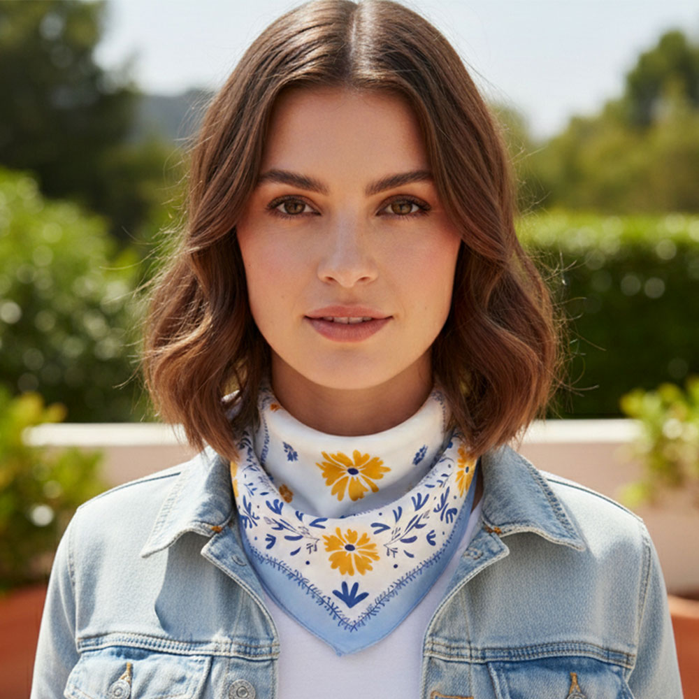 • Elevate your look with this elegant square scarf featuring a charming floral pattern and a beautifully framed border. Its versatile design works perfectly for neck styling, hair accents, or tying onto handbags, adding a touch of refined detail to any outfit effortlessly.