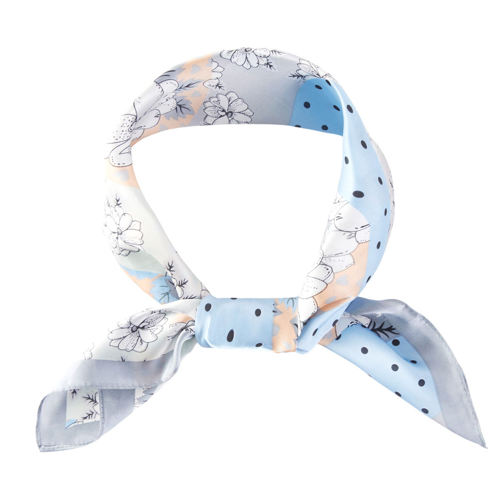 Details • Size : 27.5" X 27.5" • Material : 100% Polyester • This square scarf showcases a charming patchwork of floral motifs and playful dotted accents, offering a soft, artistic look. Lightweight and versatile, it adds a refined touch to everyday outfits, perfect for styling around the neck, hair, or as an accessory on bags.