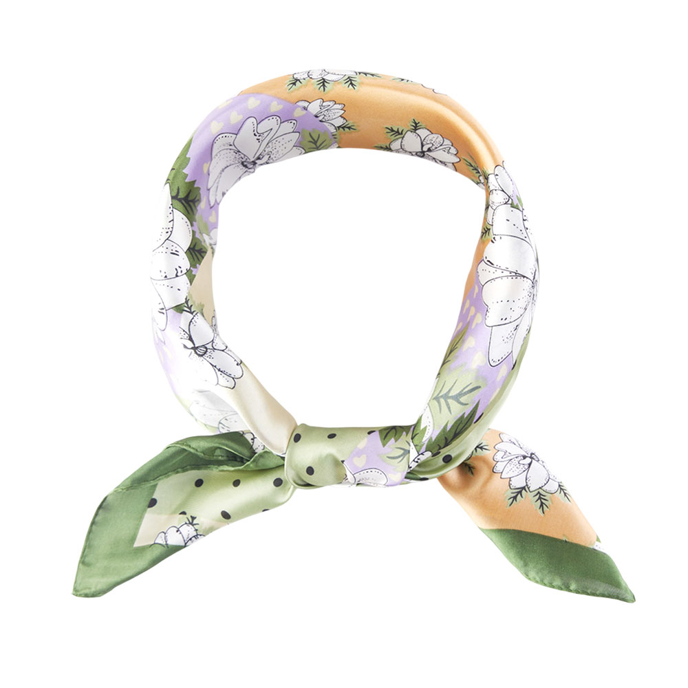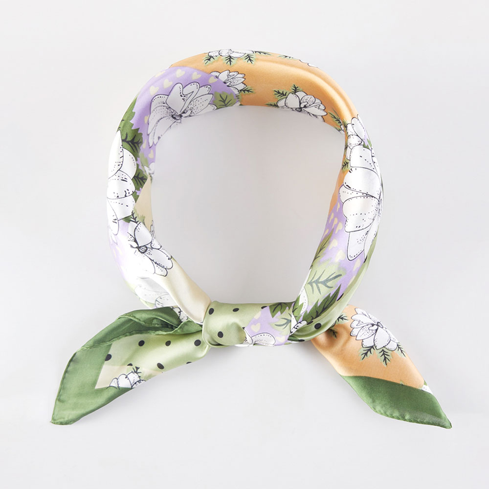 Details • Size : 27.5" X 27.5" • Material : 100% Polyester • This square scarf showcases a charming patchwork of floral motifs and playful dotted accents, offering a soft, artistic look. Lightweight and versatile, it adds a refined touch to everyday outfits, perfect for styling around the neck, hair, or as an accessory on bags.