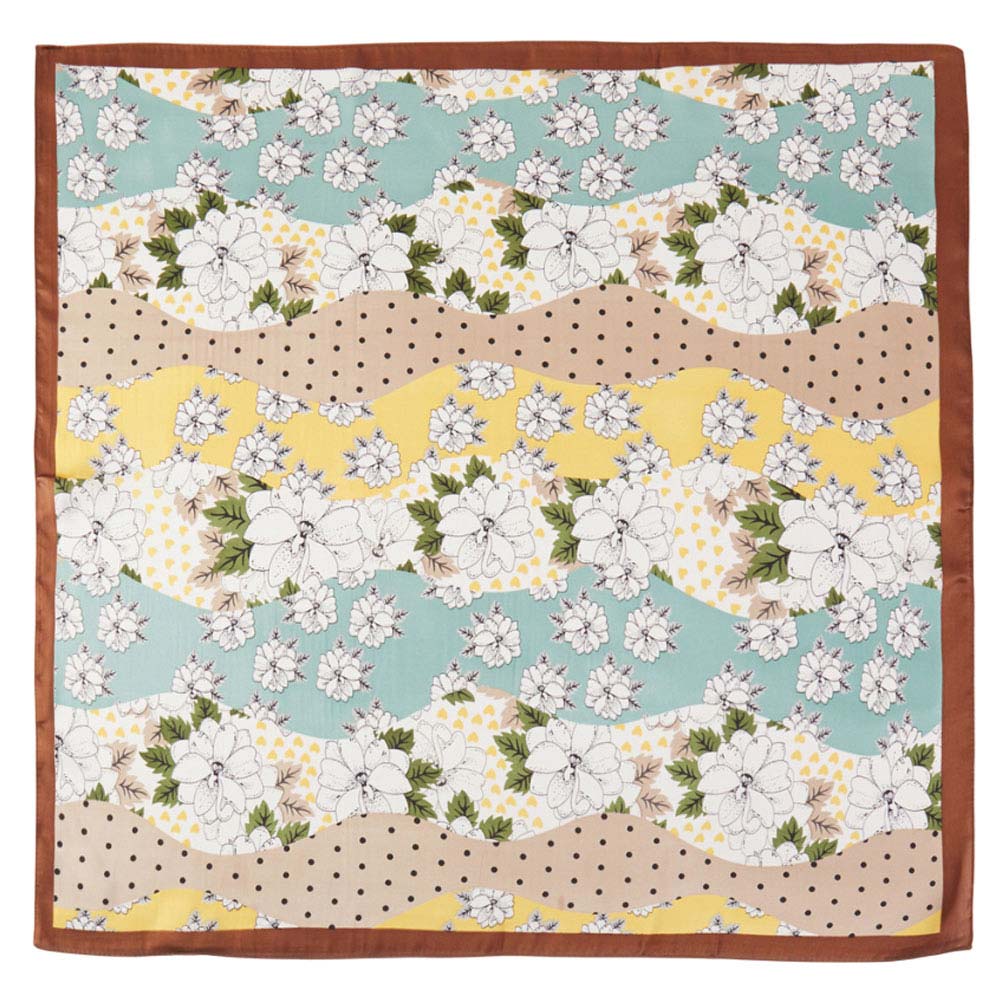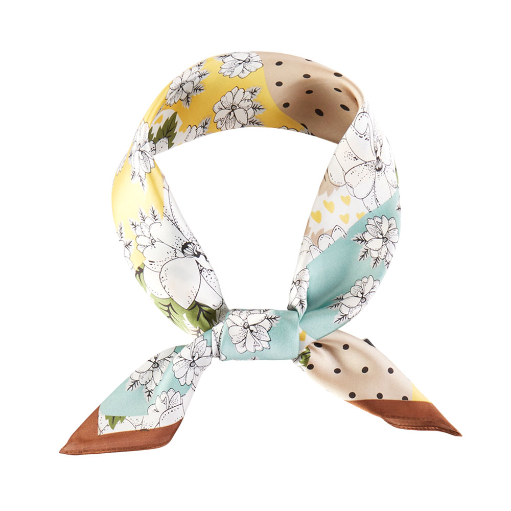 • This square scarf showcases a charming patchwork of floral motifs and playful dotted accents, offering a soft, artistic look. Lightweight and versatile, it adds a refined touch to everyday outfits, perfect for styling around the neck, hair, or as an accessory on bags.