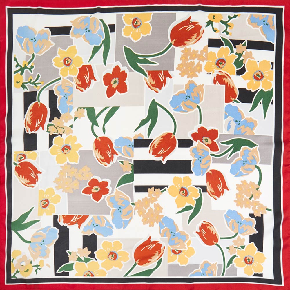 • Add a chic statement to your wardrobe with this square scarf featuring a bold mix of floral and geometric motifs. Its versatile design complements both casual and polished looks, making it ideal for wearing around the neck, in the hair, or as a stylish accessory on bags.