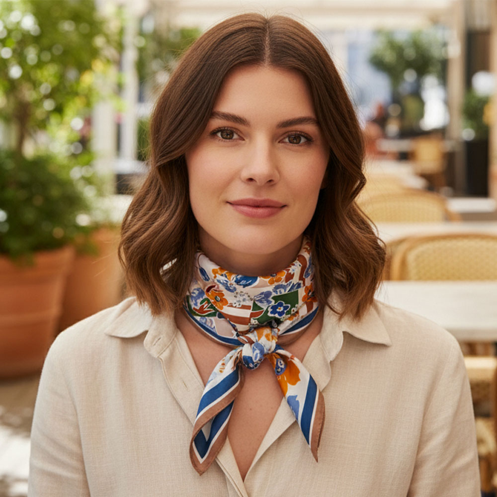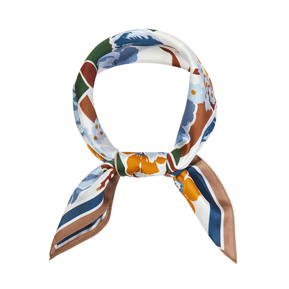 • Add a chic statement to your wardrobe with this square scarf featuring a bold mix of floral and geometric motifs. Its versatile design complements both casual and polished looks, making it ideal for wearing around the neck, in the hair, or as a stylish accessory on bags.