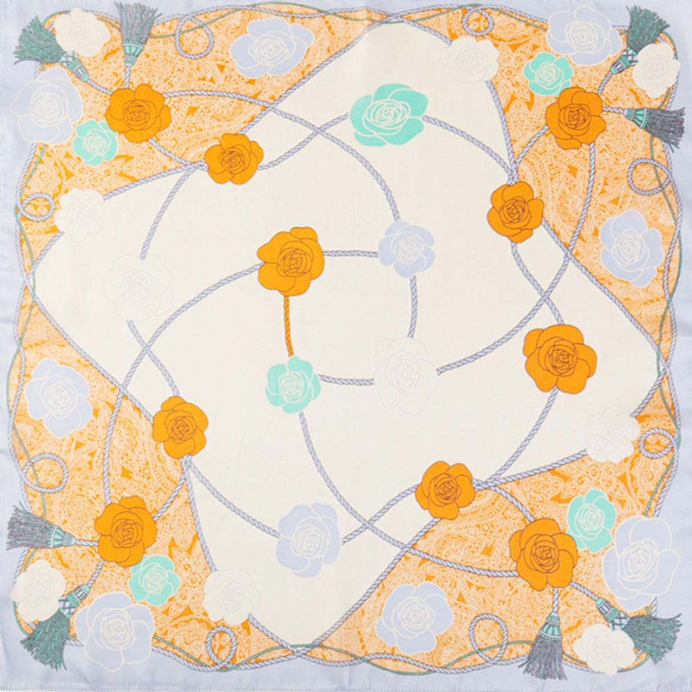 • Capture a chic, preppy look with this charming square satin-feel scarf. The unique design features stylized roses connected by an intertwined rope pattern, framed by a decorative tassel border and subtle paisley elements. The smooth, luxurious fabric and vibrant, balanced colors make this accessory a delightful statement piece for a classic, sophisticated style. Perfect as a neckerchief or tied to a handbag.