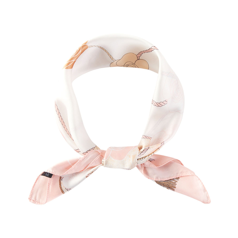 • Capture a chic, preppy look with this charming square satin-feel scarf. The unique design features stylized roses connected by an intertwined rope pattern, framed by a decorative tassel border and subtle paisley elements. The smooth, luxurious fabric and vibrant, balanced colors make this accessory a delightful statement piece for a classic, sophisticated style. Perfect as a neckerchief or tied to a handbag.