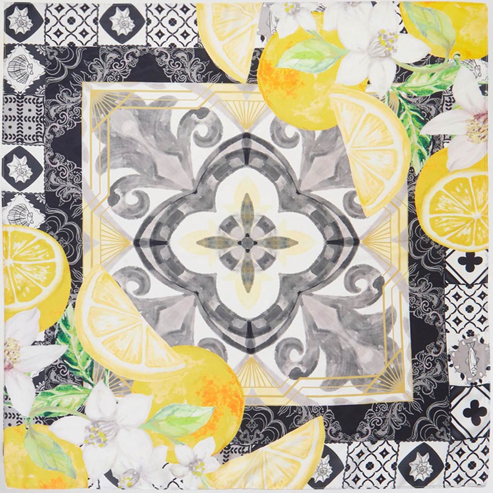• Statement square scarf featuring an artistic citrus fruit and floral motif with an ornate medallion center and decorative border. Designed for versatile styling on the neck, hair, handbag, or wrist. Ideal for boutique assortments, seasonal displays, and everyday fashion-forward accessorizing.