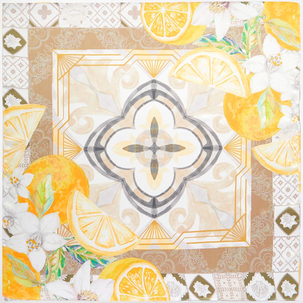 • Statement square scarf featuring an artistic citrus fruit and floral motif with an ornate medallion center and decorative border. Designed for versatile styling on the neck, hair, handbag, or wrist. Ideal for boutique assortments, seasonal displays, and everyday fashion-forward accessorizing.