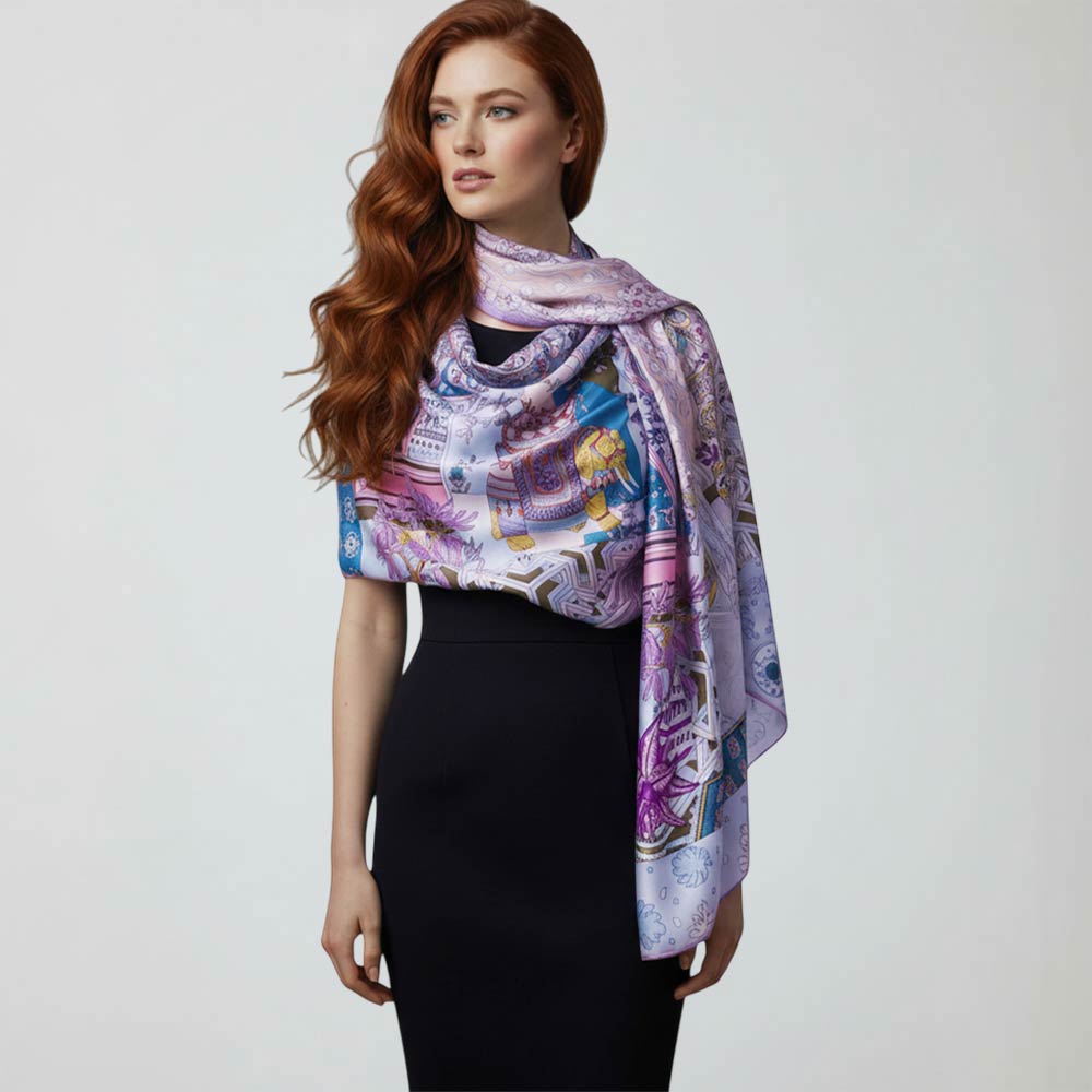 Details • Size : 35" X 78" • Material : 100% Viscose • Breathable, Lightweight, Skin-friendly and Soft • This artistic square scarf features an intricate elephant centerpiece framed by geometric patterns and decorative accents for a statement-making look. Designed for versatile styling on the neck, hair, or handbag, it’s a standout accessory for boutiques, gifting, travel collections, and fashion-forward everyday wear.
