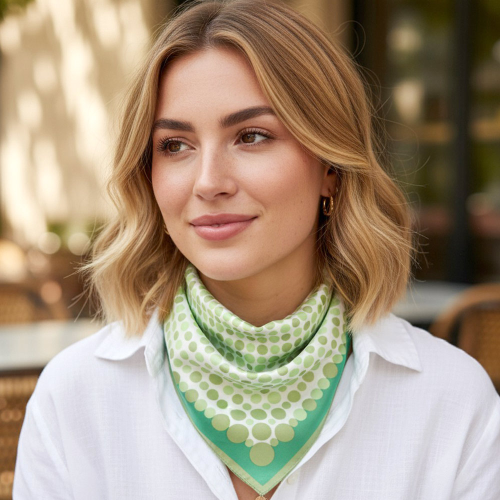 • Stylish square scarf designed with a bold polka dot pattern and clean framed layout. Easy to wear around the neck, hair, wrist, or bag for everyday styling. A versatile fashion accessory perfect for boutiques, gift shops, seasonal collections, and effortless outfit updates.