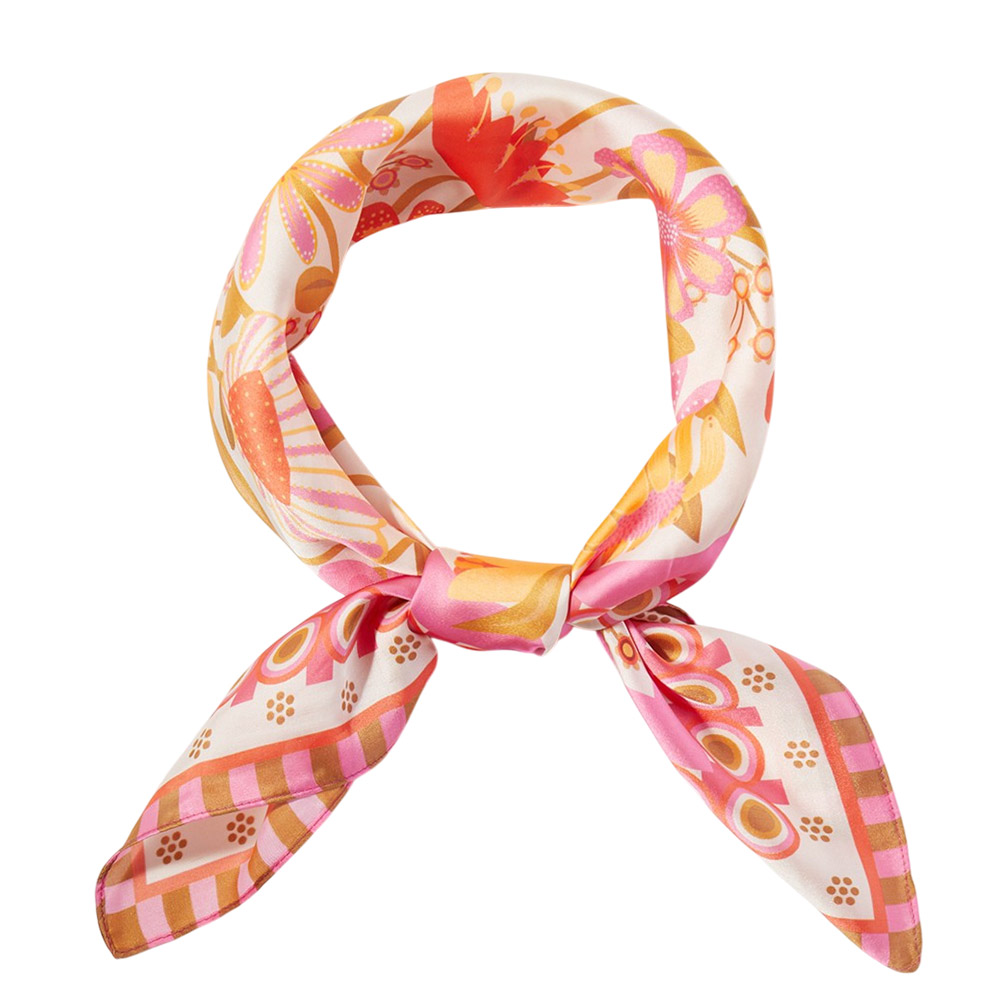 • Square fashion scarf featuring a detailed botanical meadow design with layered floral illustrations and decorative borders. Ideal for styling on the neck, hair, wrist, or handbag, this versatile accessory brings a fresh, artistic accent to everyday looks, seasonal outfits, and curated boutique collections.