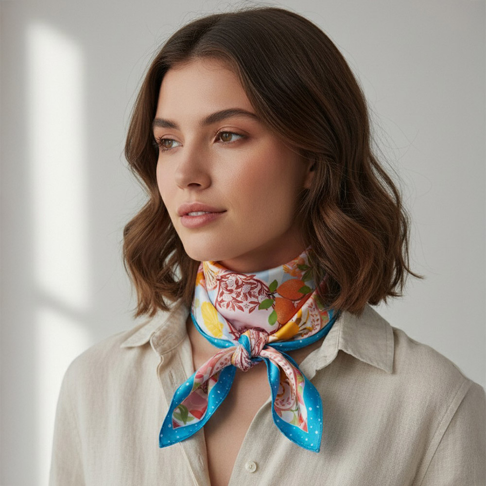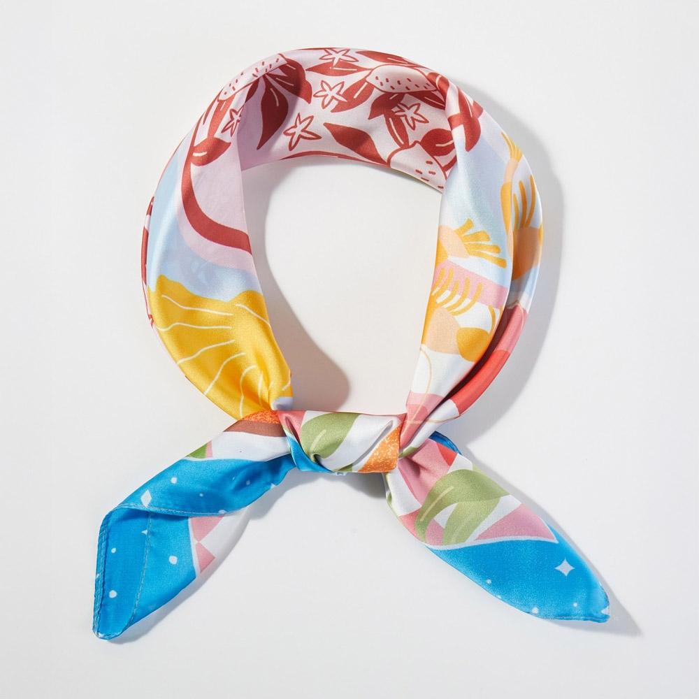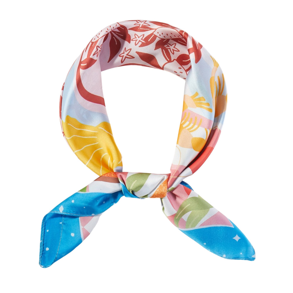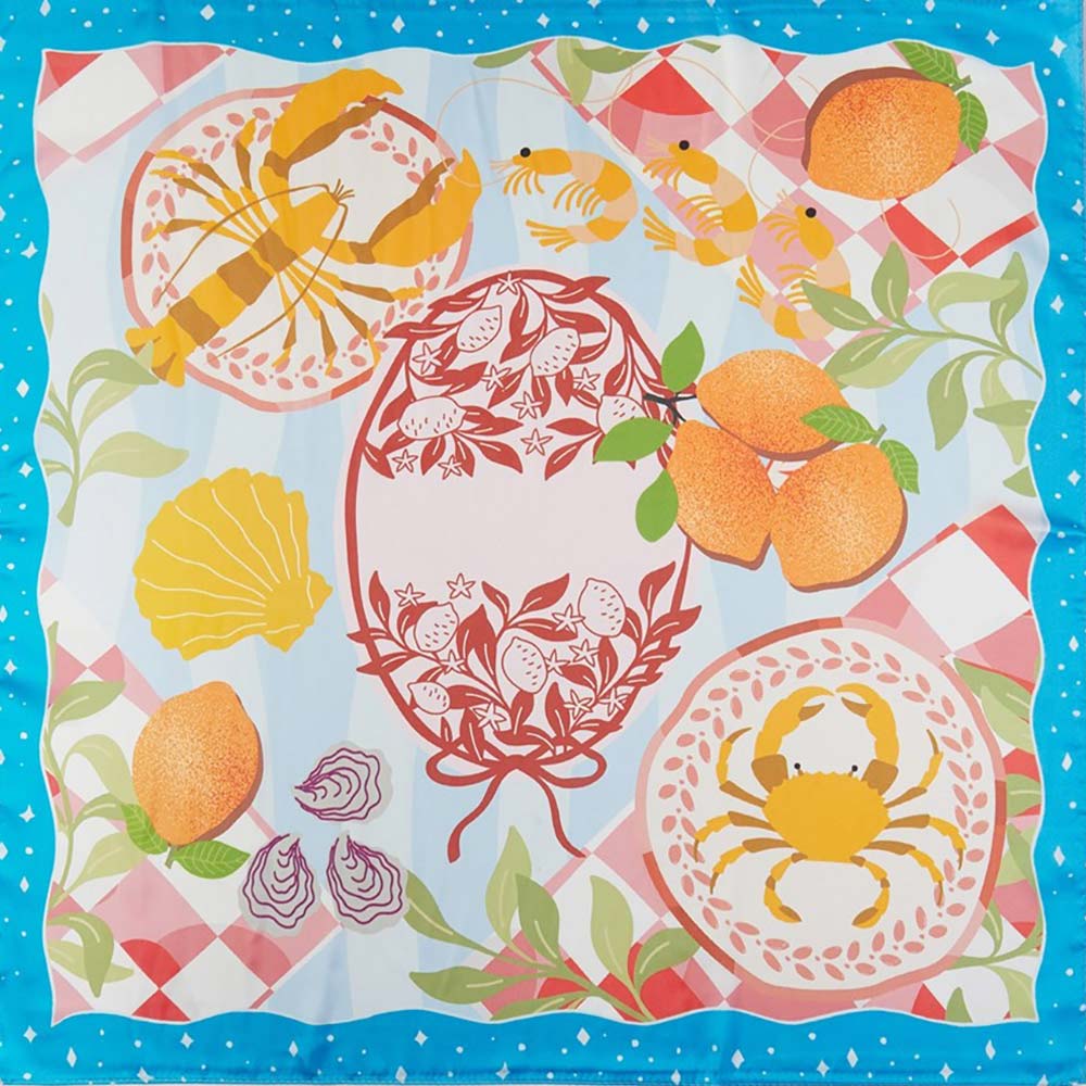 • Square fashion scarf featuring a playful coastal seafood and citrus inspired illustration with decorative motifs. Designed for versatile styling as a neck scarf, hair wrap, or bag accent, offering boutiques a fresh, eye-catching accessory that works for seasonal collections, resort edits, and everyday statement looks.