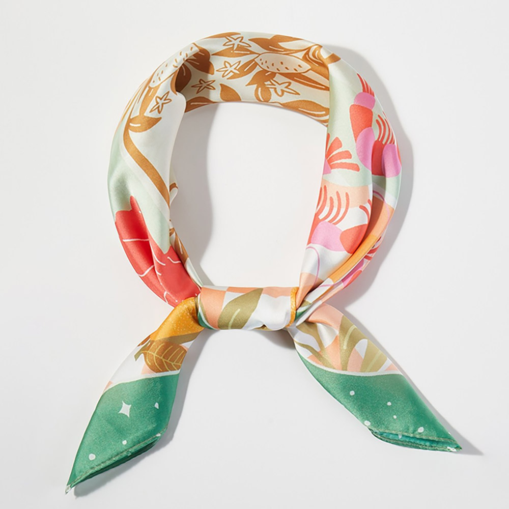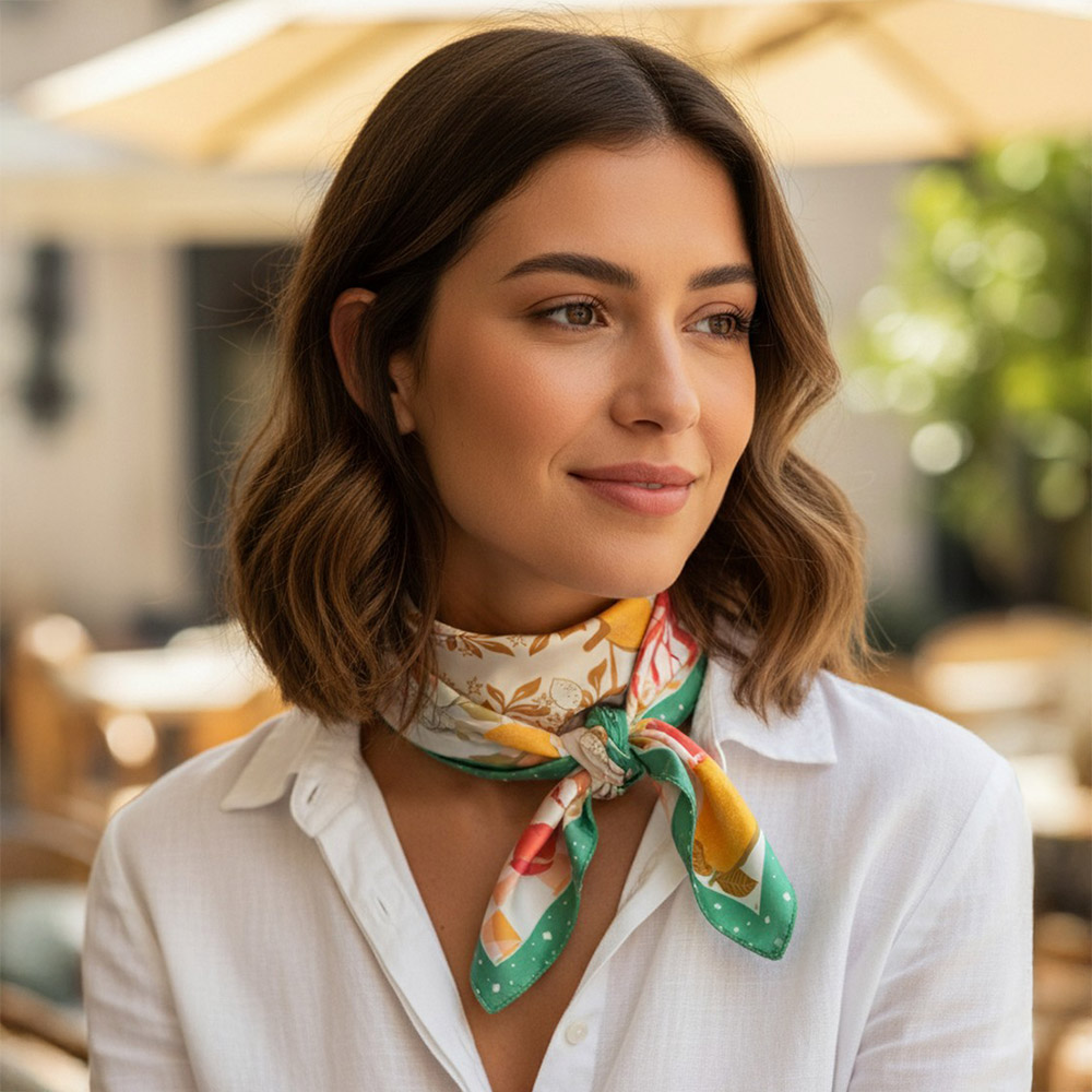 • Square fashion scarf featuring a playful coastal seafood and citrus inspired illustration with decorative motifs. Designed for versatile styling as a neck scarf, hair wrap, or bag accent, offering boutiques a fresh, eye-catching accessory that works for seasonal collections, resort edits, and everyday statement looks.