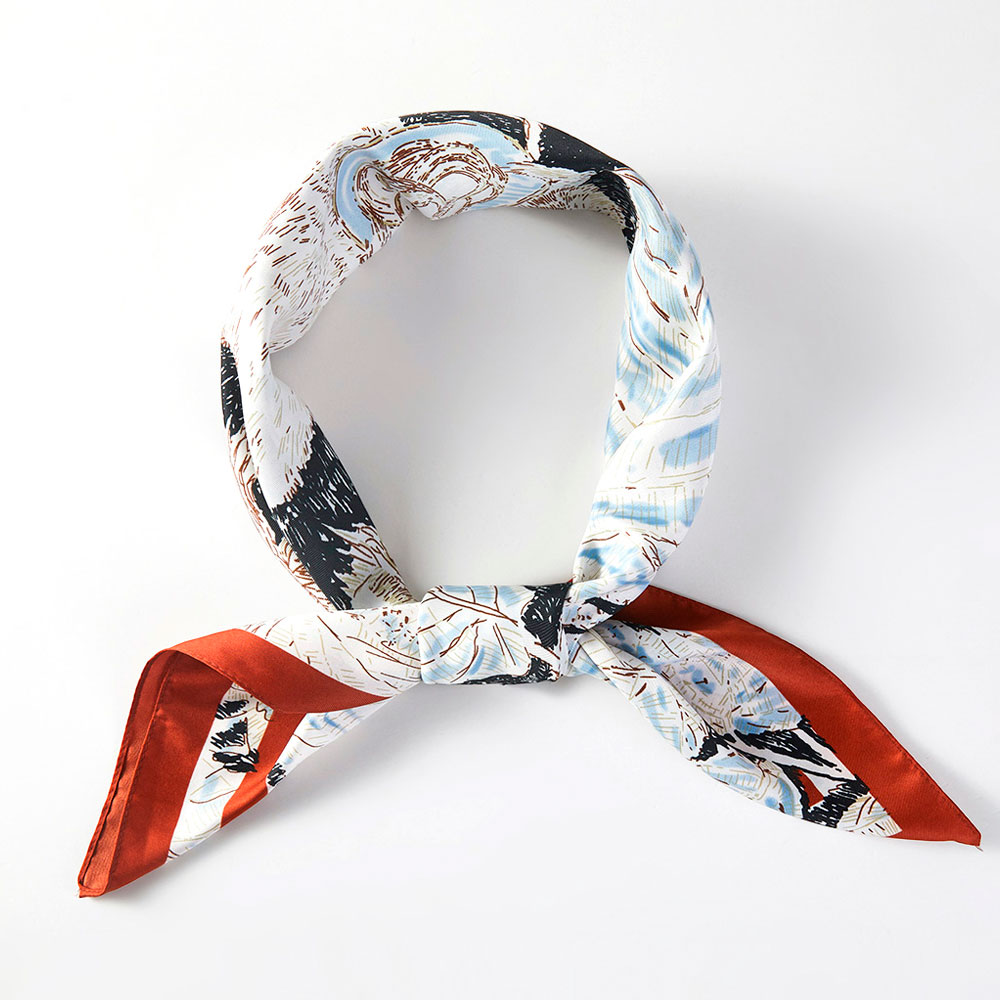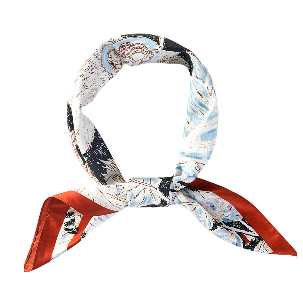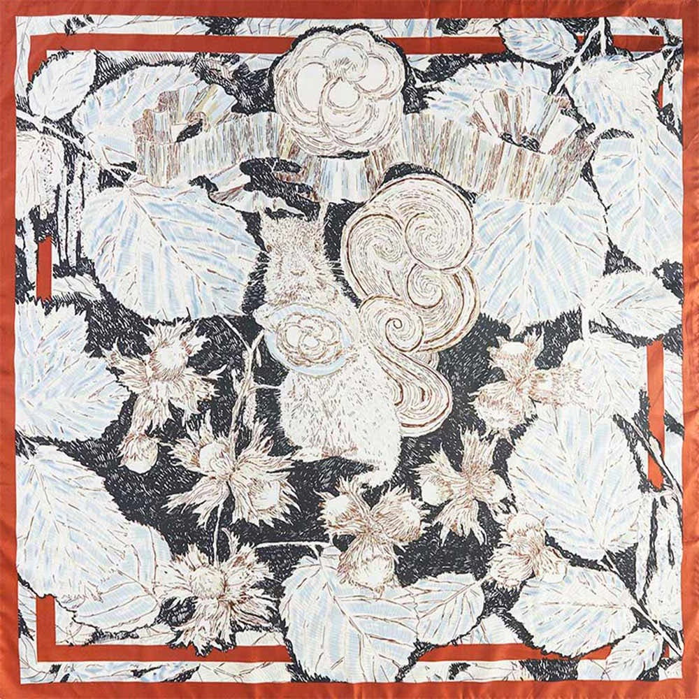 • Elevate your look with this whimsical square scarf featuring a playful squirrel surrounded by lush foliage artwork. Designed with a detailed nature illustration framed in an elegant border, this versatile accessory adds charm whether styled around the neck, hair, or bag. A unique gift for animal lovers and a standout piece for everyday outfits.