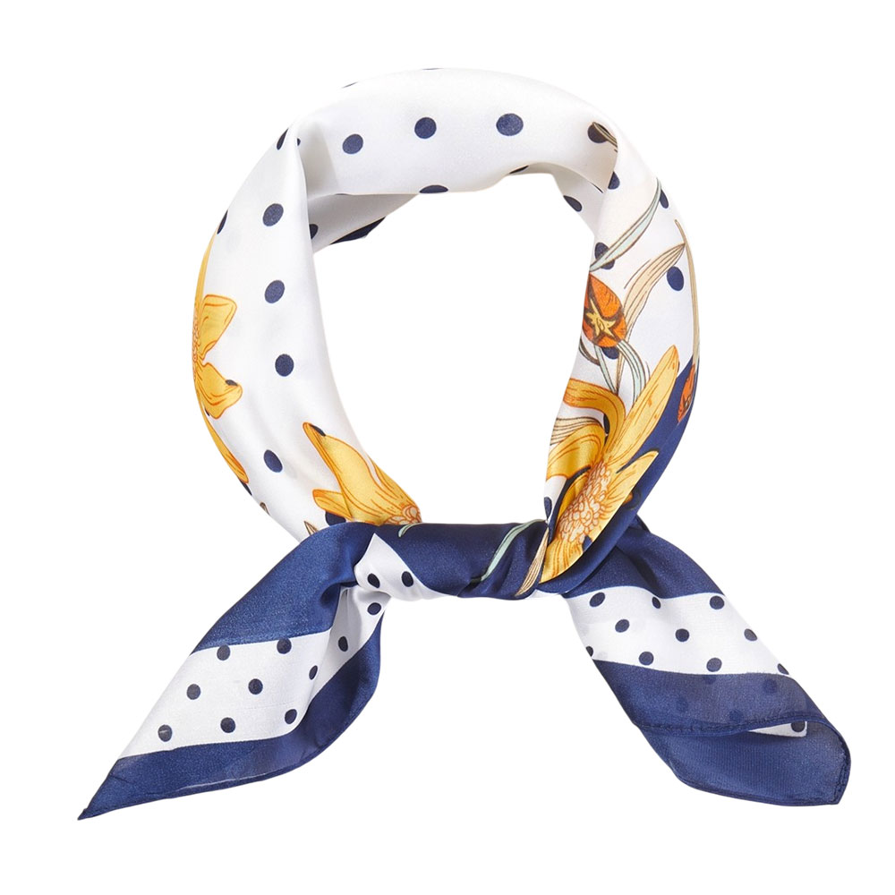 • Elegant square fashion scarf featuring a floral border with classic polka dot detailing. Designed for versatile styling around the neck, hair, handbag, or wrist, this timeless accessory adds a refined, feminine accent to everyday looks, seasonal outfits, and curated boutique collections.