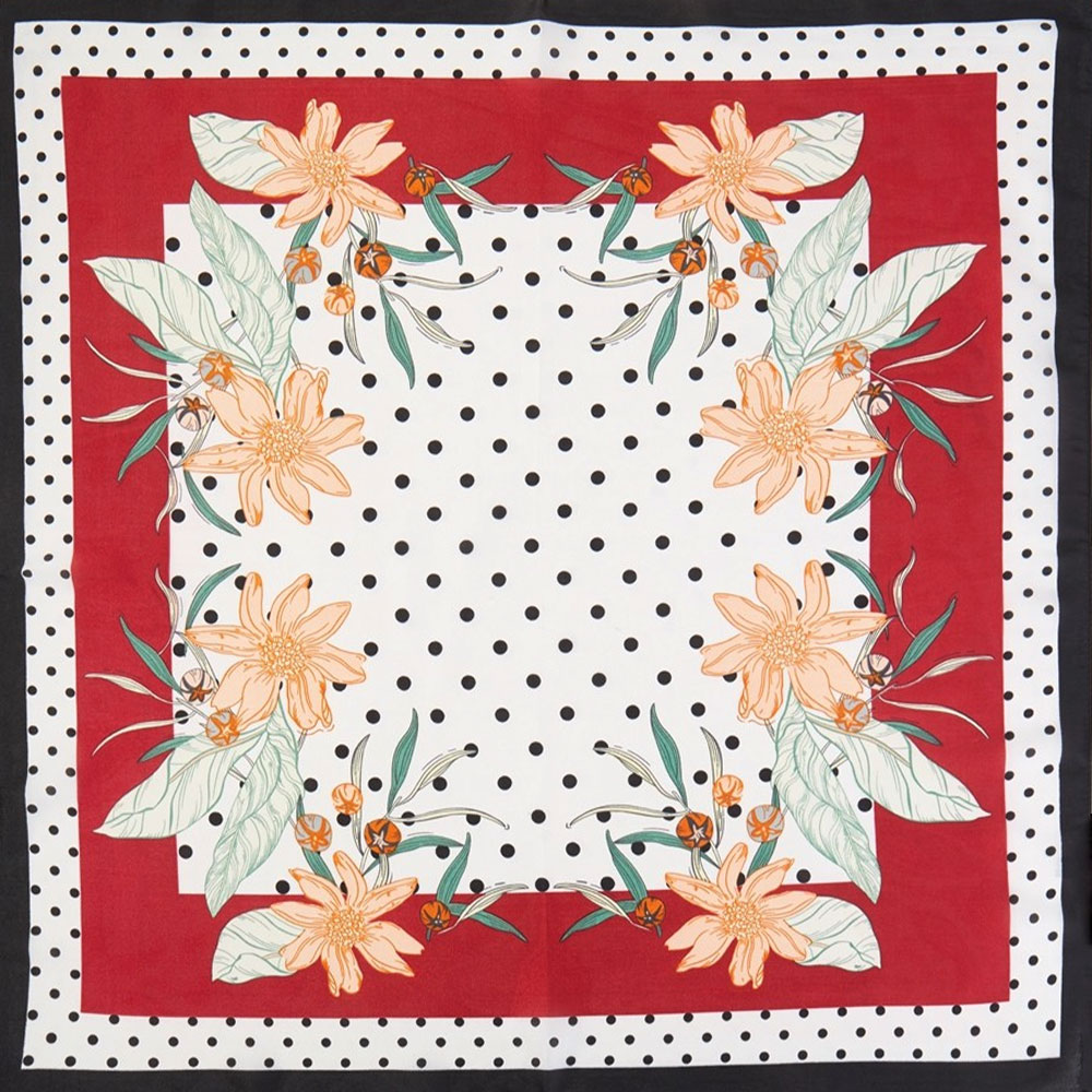 Details • Size : 27.5" X 27.5" • Material : 100% Polyester • Elegant square fashion scarf featuring a floral border with classic polka dot detailing. Designed for versatile styling around the neck, hair, handbag, or wrist, this timeless accessory adds a refined, feminine accent to everyday looks, seasonal outfits, and curated boutique collections.