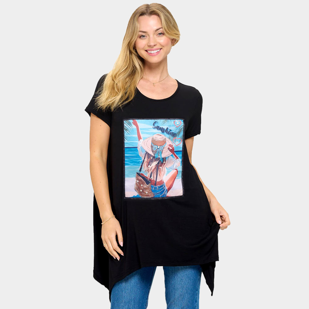 Stone Studded Sunshine Message Beach Woman Printed Half Sleeve Top