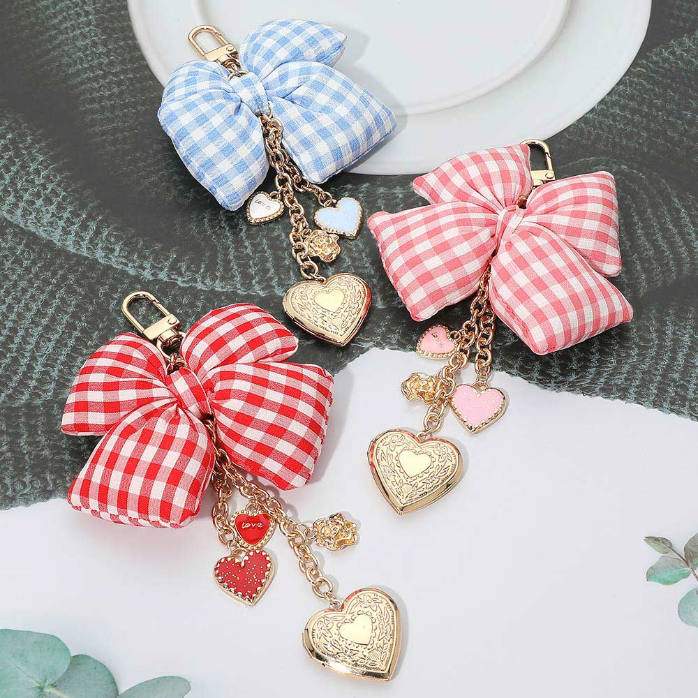 Details • Size : 6.5" L, 3.5" X 5.25" • Decorative bag charm keychain featuring a soft bow accent paired with dangling heart and locket charms. Designed to add a romantic, playful touch to handbags, backpacks, and keys. Ideal for gifting, seasonal collections, and boutique displays seeking charming statement accessories. • Lead and Nickel Compliant