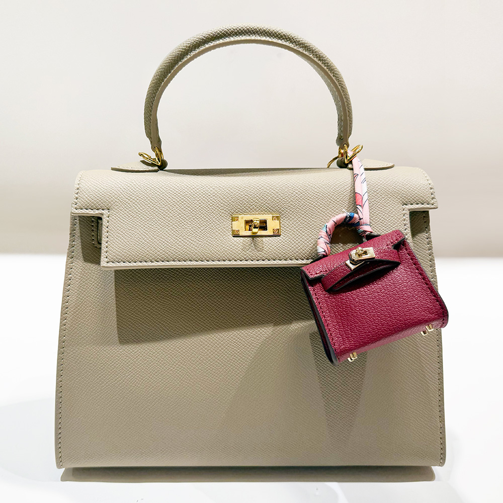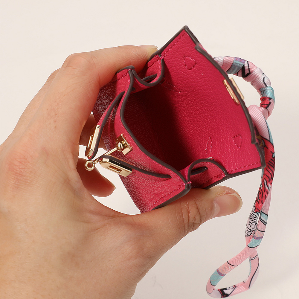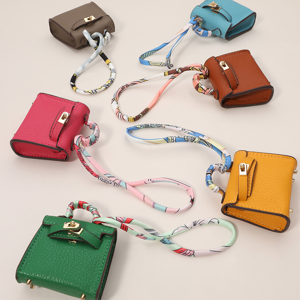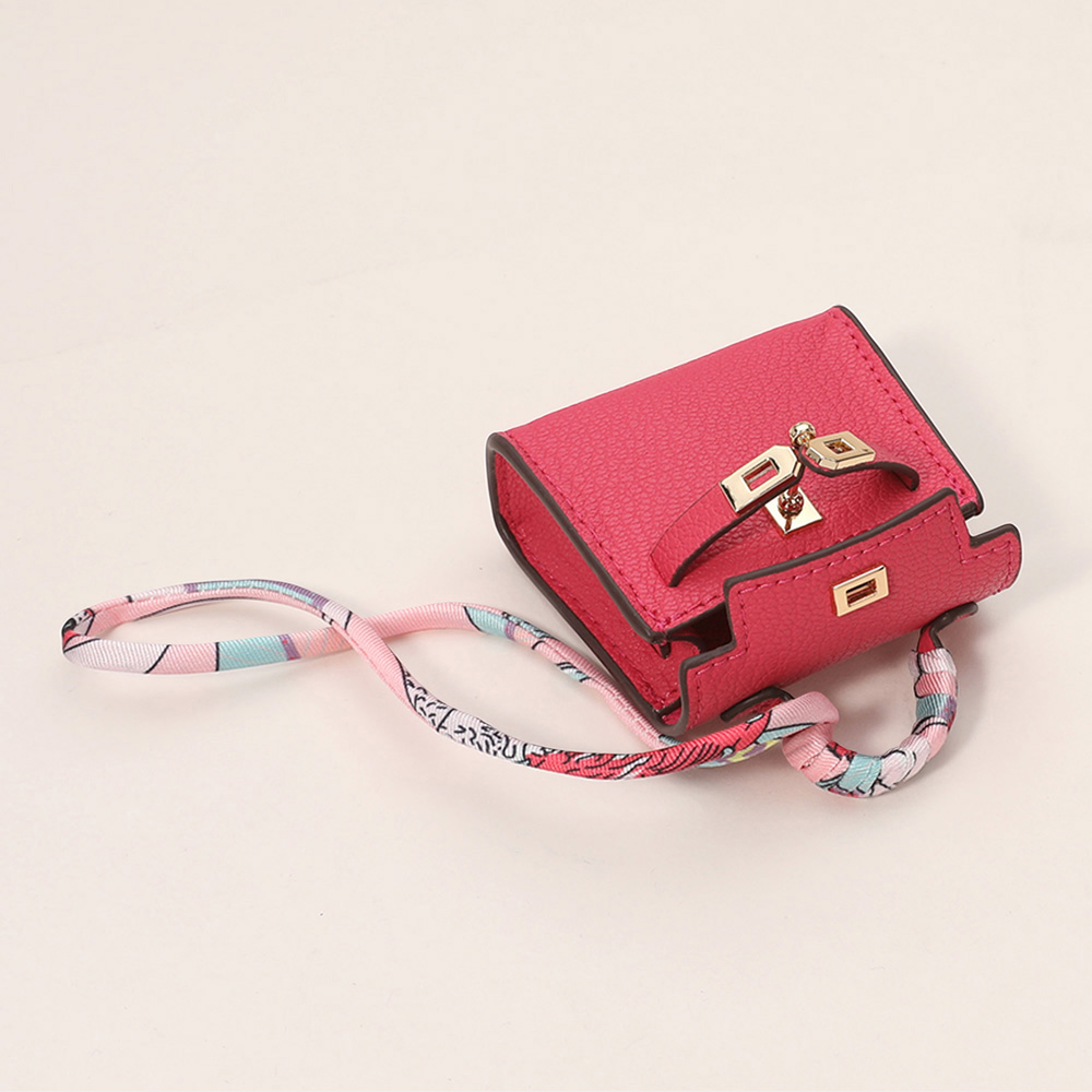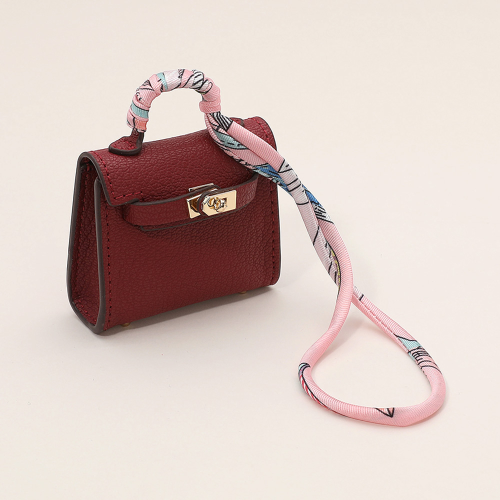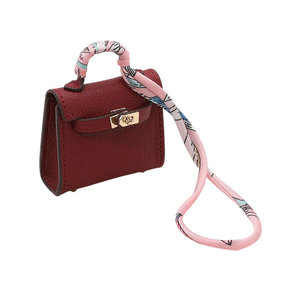 Details • Size : 2.2" X 2.6" X 1" • Top Handle Size : 0.75" L • Strap Size : 2" L / Detachable, Fabric scarf-style strap for easy attachment • Miniature handbag-style lock closure • Decorative metal rivets and clasp hardware detail • fits Earphone, Earbuds, Small Accessory • Can be used as a keychain, bag charm, or collectible accessory • Material : 100% Polyurethane