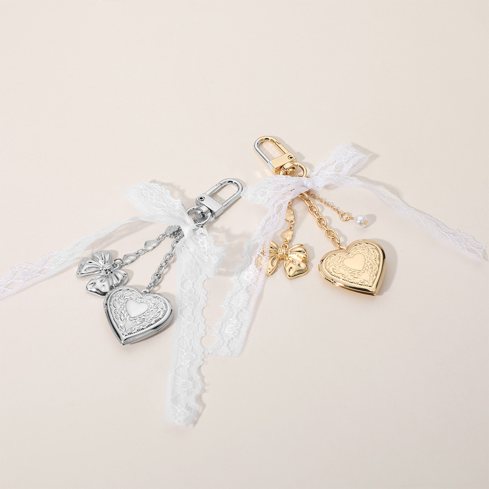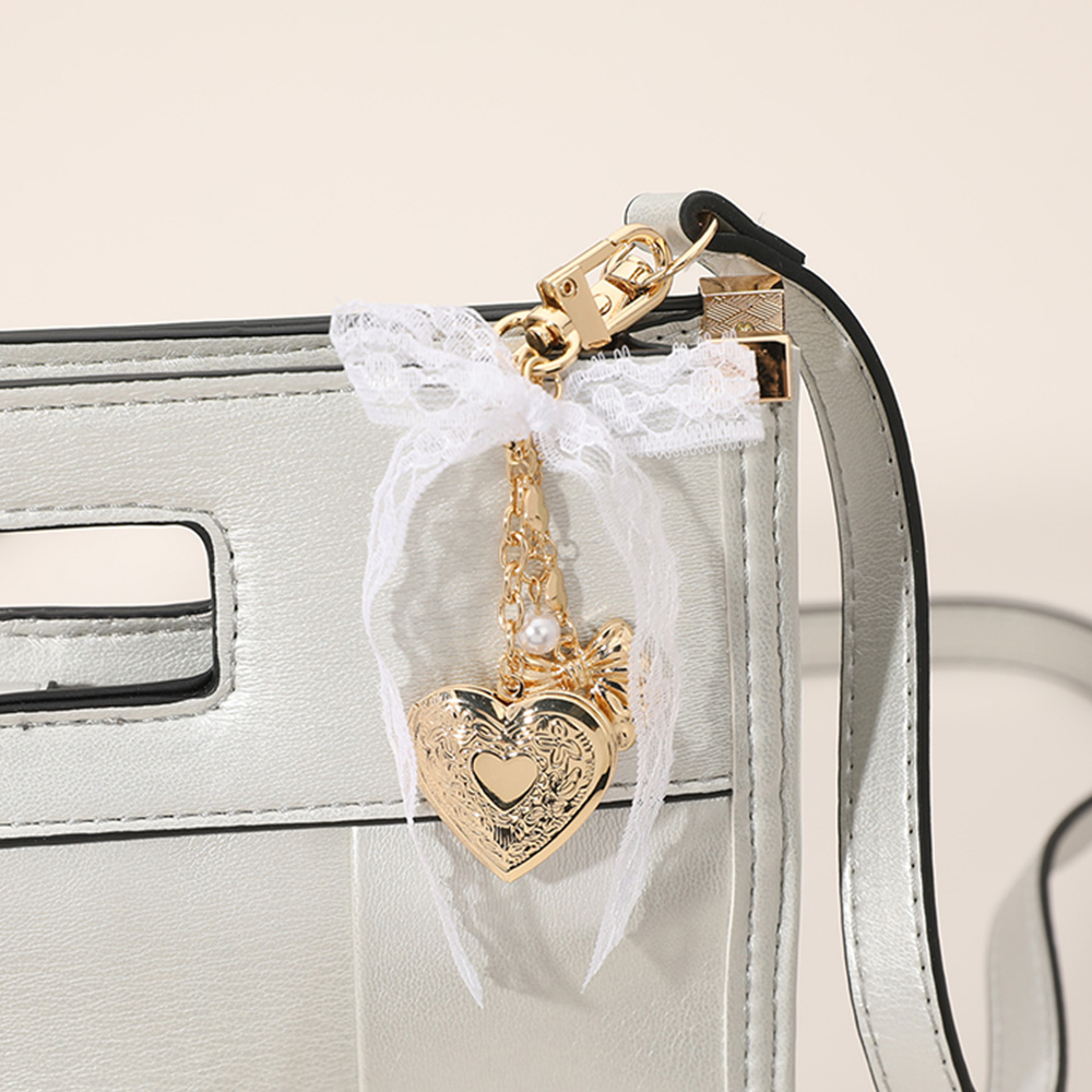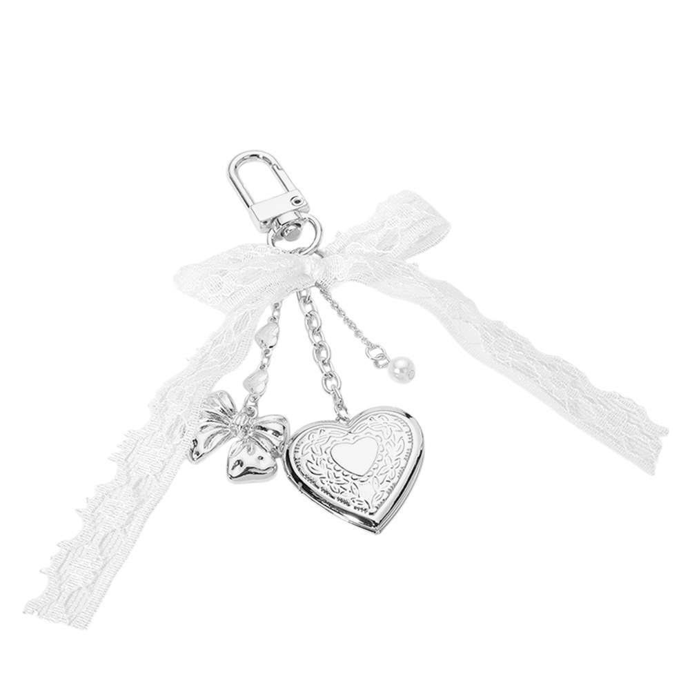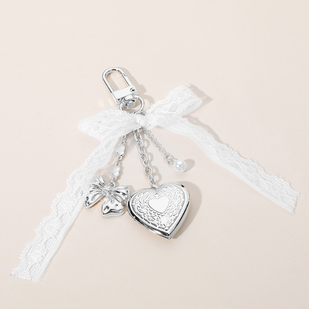 Metal Heart Locket Pearl Lace Bow Embellished Bag Charm Keychain