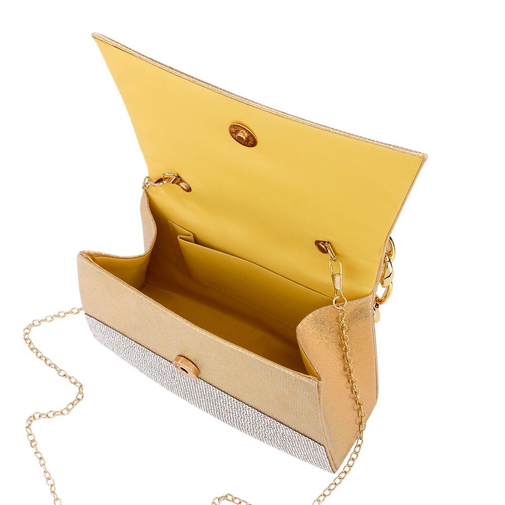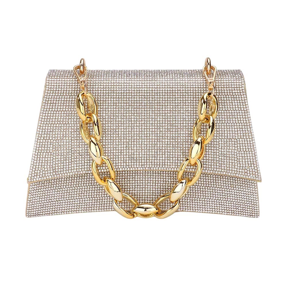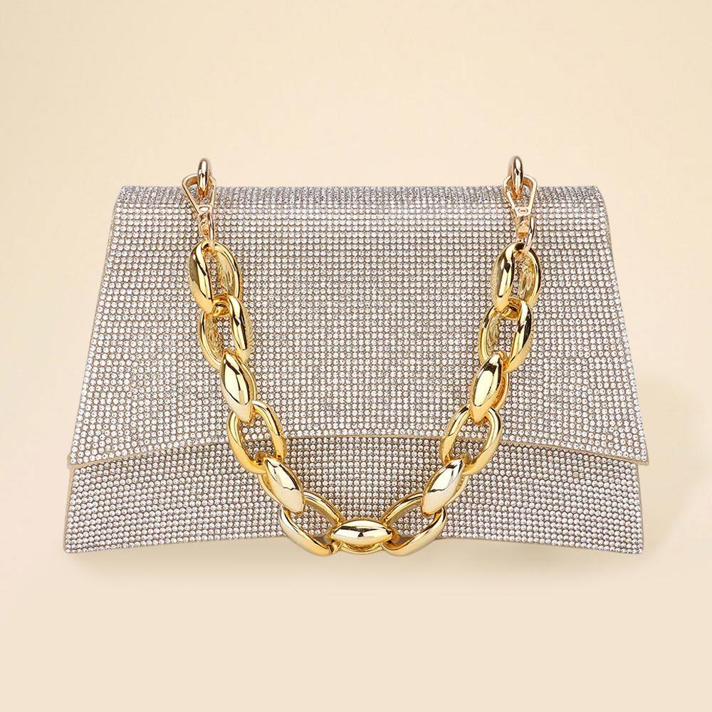 • Shimmering rhinestone evening bag featuring a bold chain handle and structured silhouette. Designed for effortless sophistication, it offers a secure flap closure and eye-catching shine, making it the perfect accessory for special events or elevated everyday style.