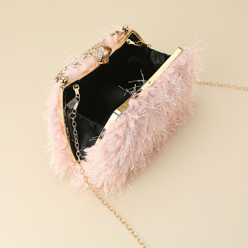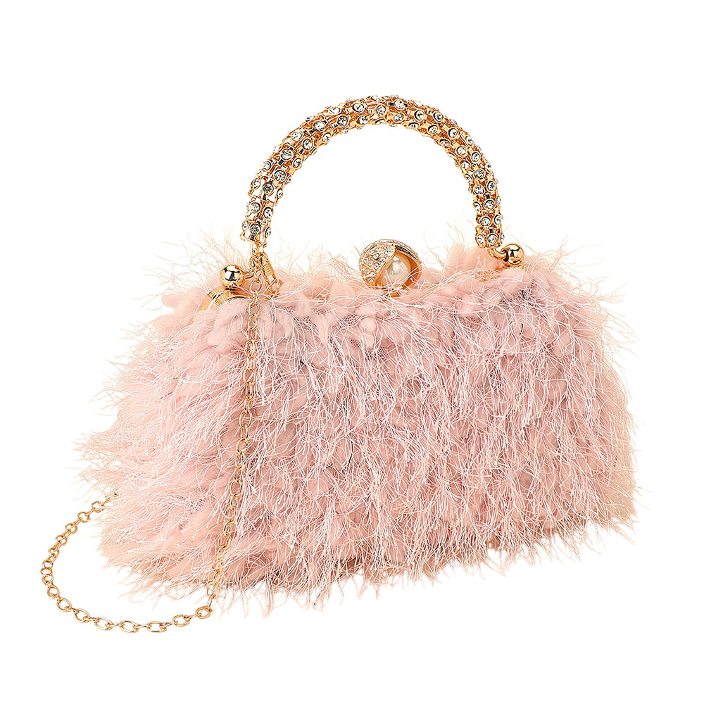 • This elegant evening bag features soft feather accents, a crystal-embellished handle, and a delicate chain strap for versatile carrying. Perfect for formal events or glamorous nights out, it adds a statement touch of luxury and sophistication to any outfit.