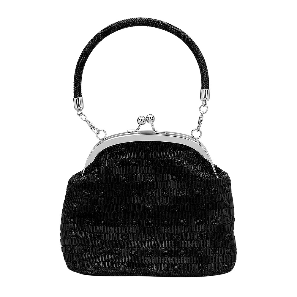 Details • Size : 7.5" X 6" X 4" • Strap Size : 46" L / Detachable • Clasp Closure • Discover a refined evening handbag featuring intricate embellishments, a structured frame, and a sparkling top handle designed for timeless sophistication. Its secure clasp and smooth interior offer both elegance and practicality for special occasions.