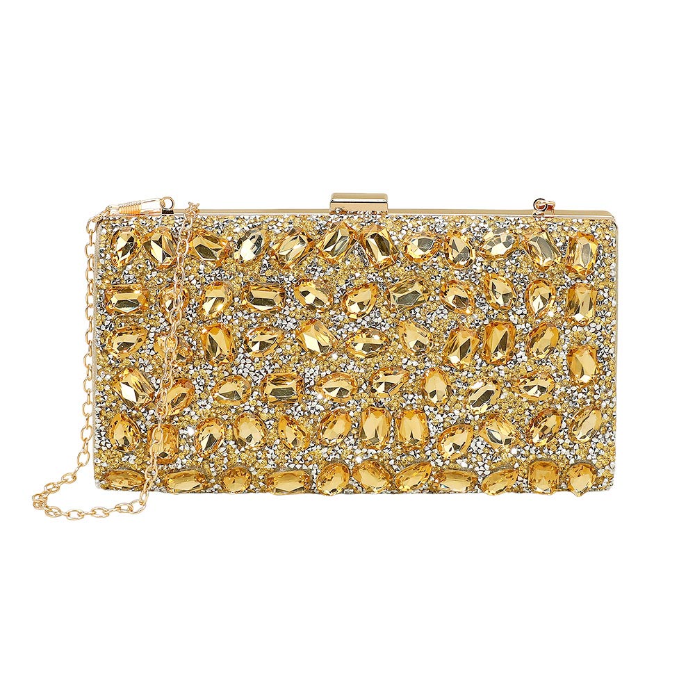 Details • Size : 8.6" X 4.6" X 1.6" • Strap Size : 47" L / Detachable • Clasp Closure • Glamorous evening clutch adorned with sparkling stone accents for a statement look. Designed with a sleek silhouette and chain strap, this stylish accessory adds a touch of elegance to special occasions, parties, and night-out outfits.
