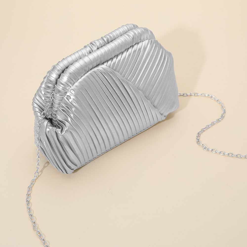 • This refined evening clutch showcases a sculpted, pleated exterior with a soft, structured silhouette that adds dimension and elegance. A detachable chain strap offers styling versatility, making it an ideal accessory for special events, nights out, or polished everyday looks.