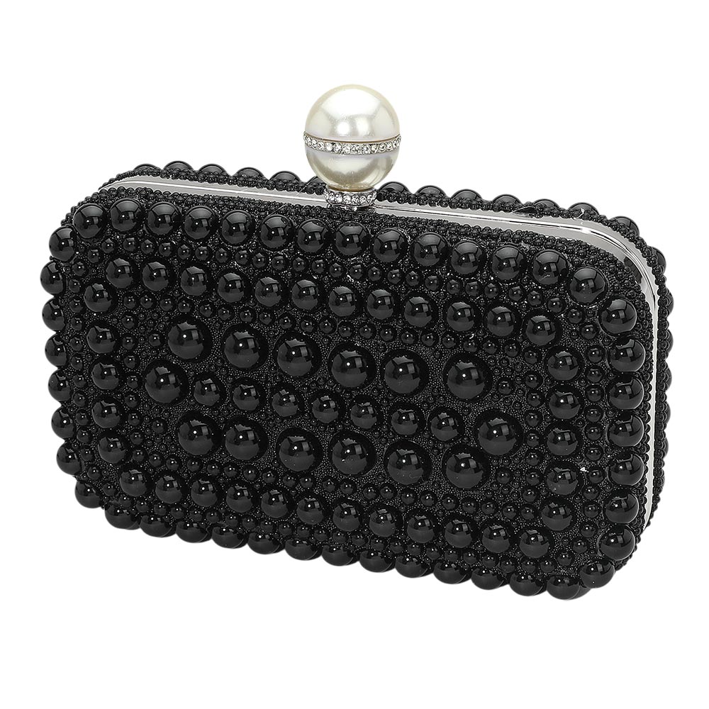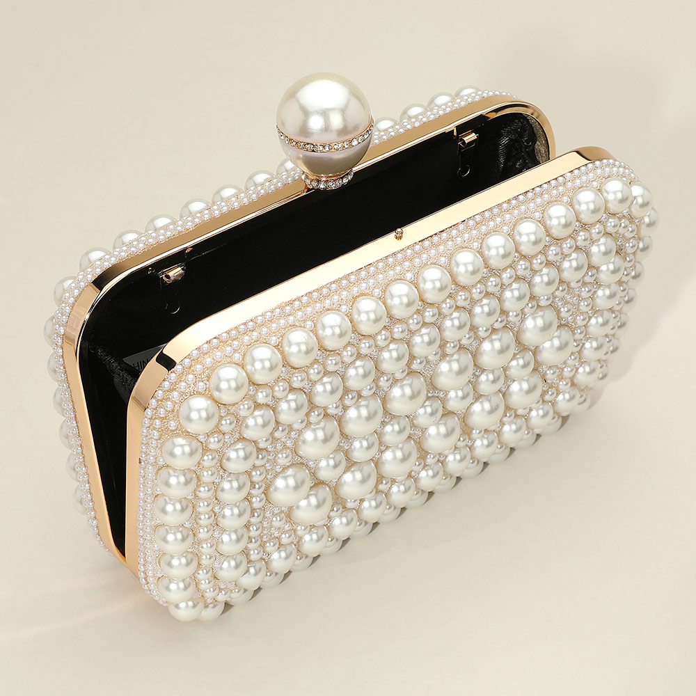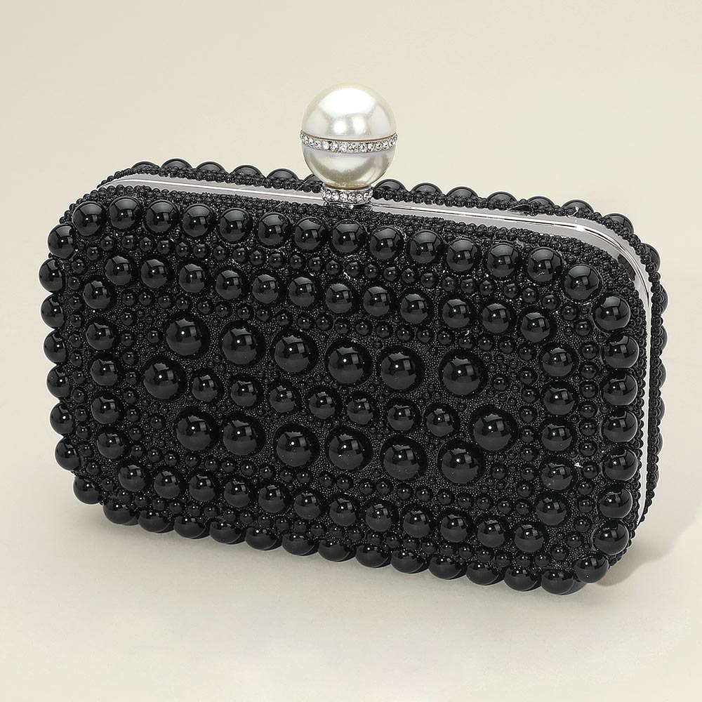 Details • Size : 8" X 4.5" X 2.25" • Pearl Clasp Size : 1.4" L • Strap Size : 46" L / Detachable • Clasp Closure • Elegant evening clutch adorned with layered faux pearl detailing and a statement dome clasp. Perfect for weddings, parties, and formal occasions. Structured box shape with luxe finish.