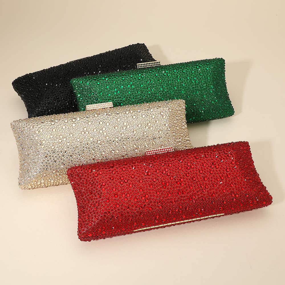 Details • Size : 9.5" X 4" X 2.25" • Strap Size : 46" L / Detachable • Clasp Closure • This dazzling rhinestone clutch adds instant glamour to any evening look. Featuring a sleek rectangular design and a detachable chain strap, it offers versatile carry options. Perfect for weddings, parties, or formal events, this clutch keeps essentials secure in chic style.