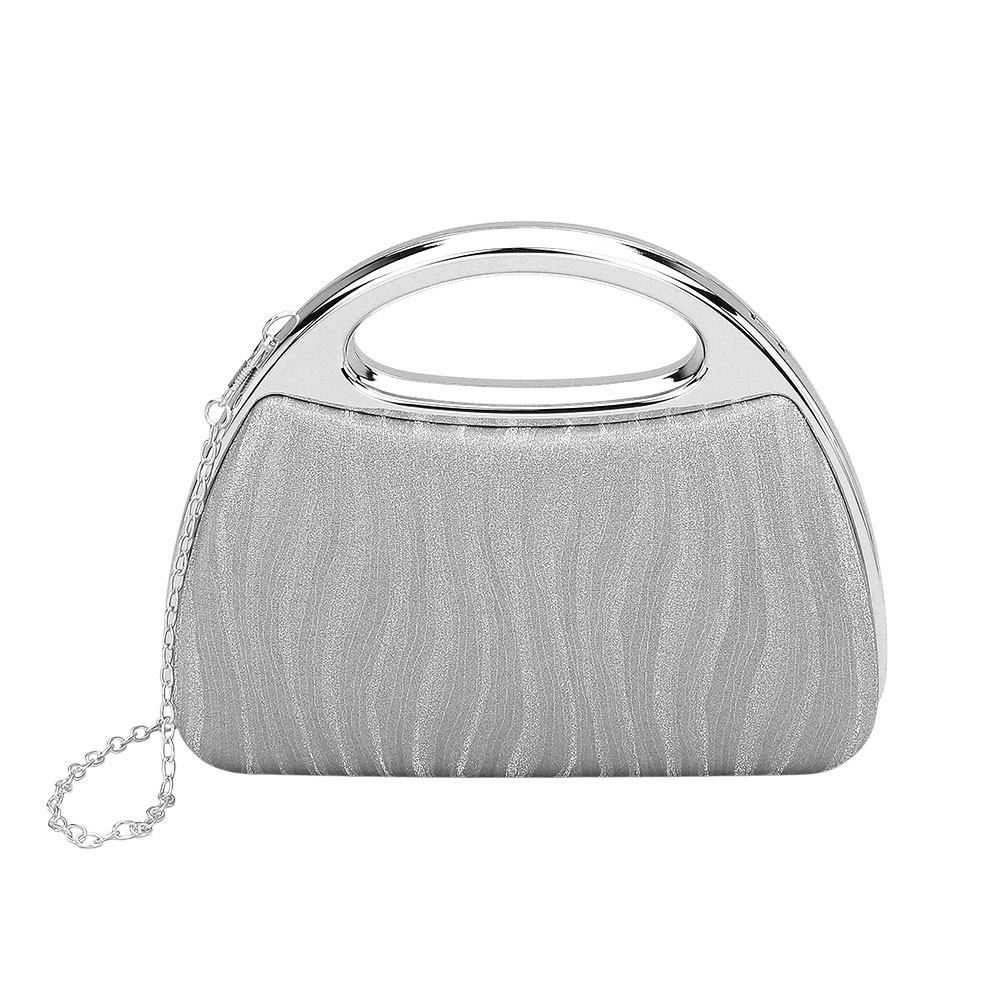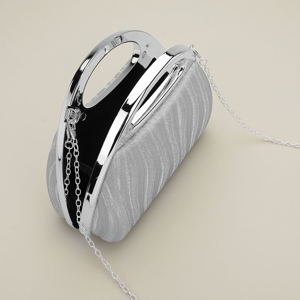 • A refined evening handbag featuring a sculpted silhouette, metallic handle, and shimmering textured body. Designed for formal events, it offers a polished finish and a detachable chain for versatile styling, keeping essentials organized while enhancing any sophisticated look.