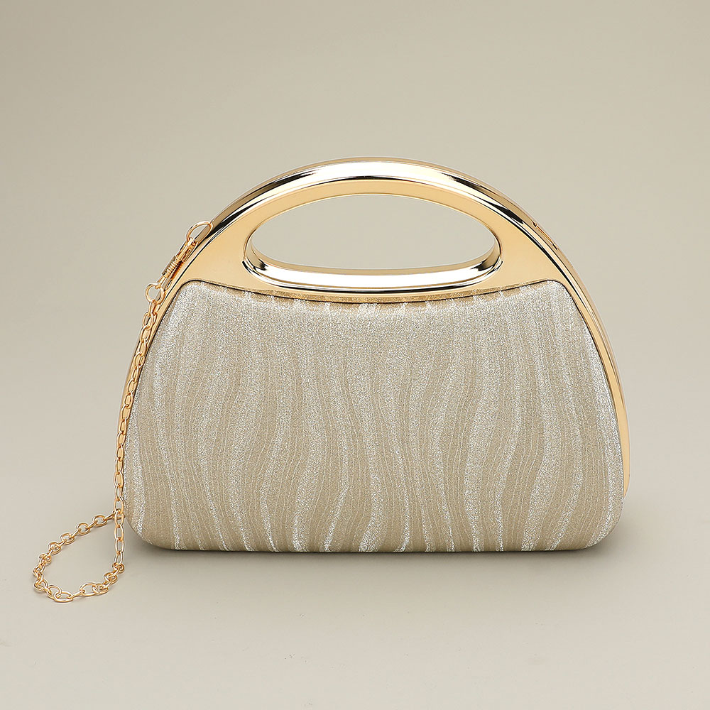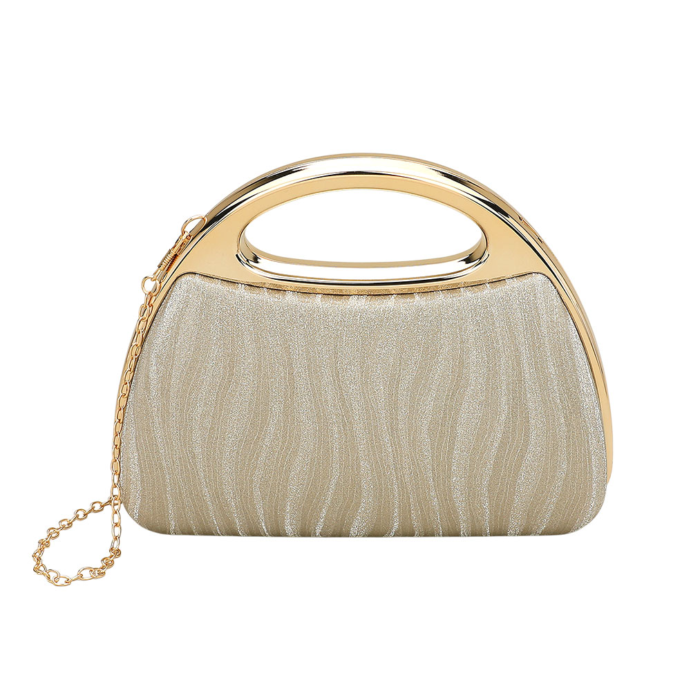 Details • Size : 8.5" X 6.5" X 3" • Top Handle Size : 2" L • Strap Size : 46"L • Clasp Closure • A refined evening handbag featuring a sculpted silhouette, metallic handle, and shimmering textured body. Designed for formal events, it offers a polished finish and a detachable chain for versatile styling, keeping essentials organized while enhancing any sophisticated look.