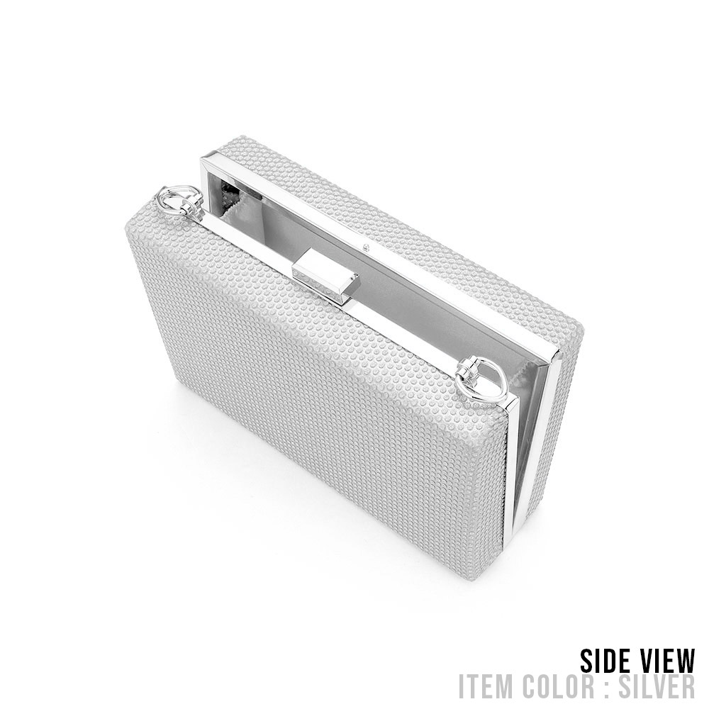 • Chic rectangular evening clutch with shimmering texture and detachable chain strap, perfect for weddings, parties, and special events. Features a sleek clasp closure and compact interior for essentials, combining sophistication and sparkle for timeless formal style.