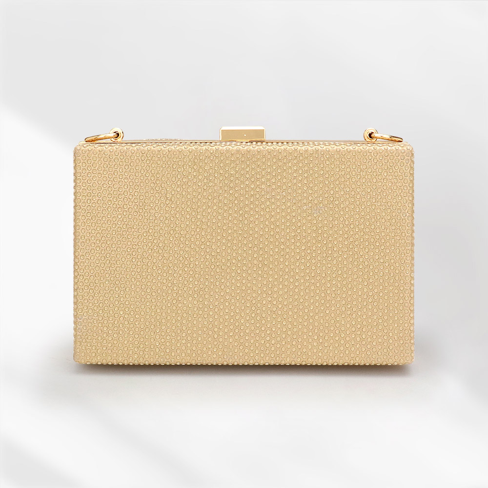 • Chic rectangular evening clutch with shimmering texture and detachable chain strap, perfect for weddings, parties, and special events. Features a sleek clasp closure and compact interior for essentials, combining sophistication and sparkle for timeless formal style.