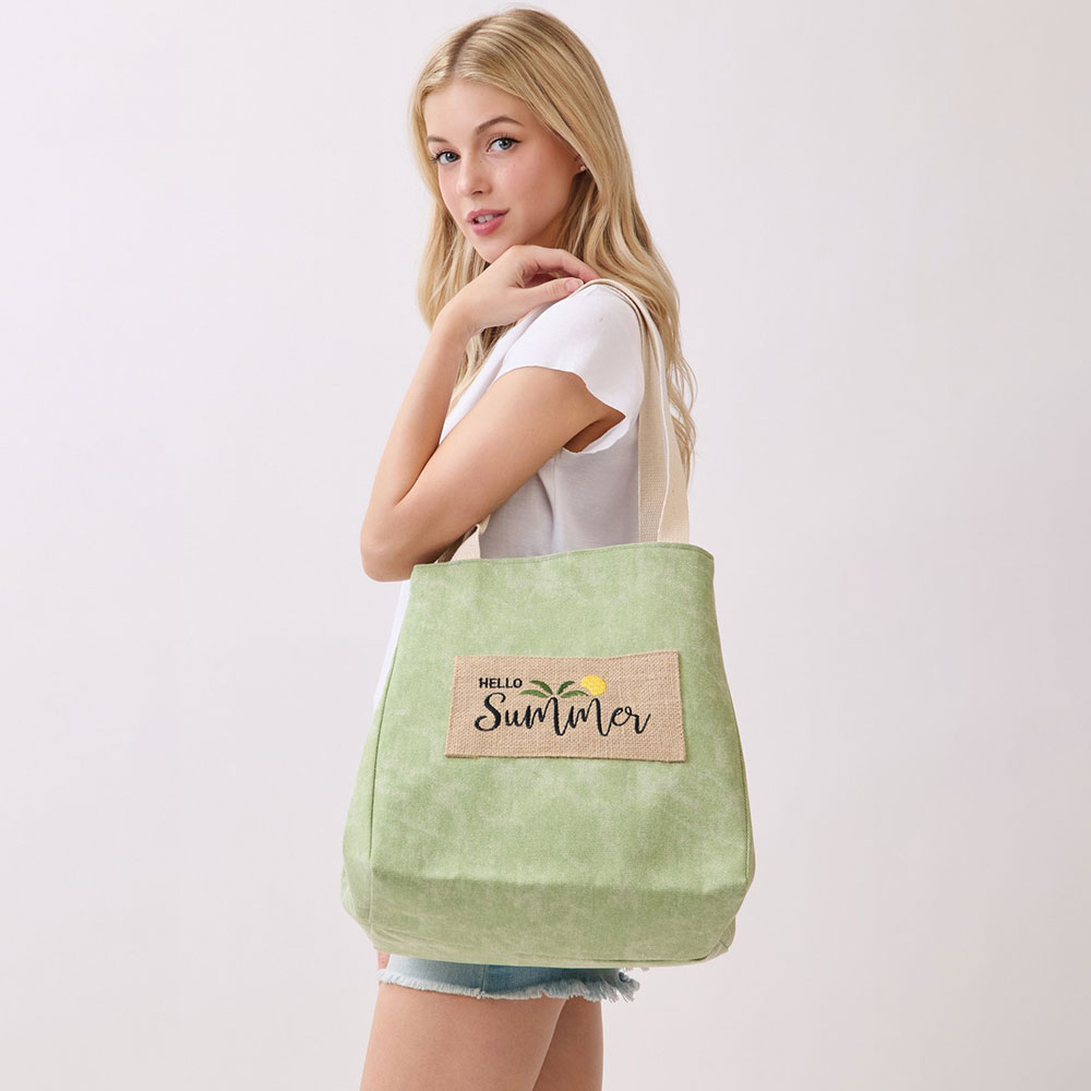 Details • Size : 22" X 13" X 9.5" • Inner Pocket • Magnetic Snap Closure • Material : 90% Polyester, 10% Burlap • Spacious everyday tote bag designed with a message patch for casual outings, travel, beach trips, and seasonal retail displays. Features a roomy interior and comfortable shoulder straps, making it ideal for carrying daily essentials, vacation must-haves, and warm-weather lifestyle accessories.