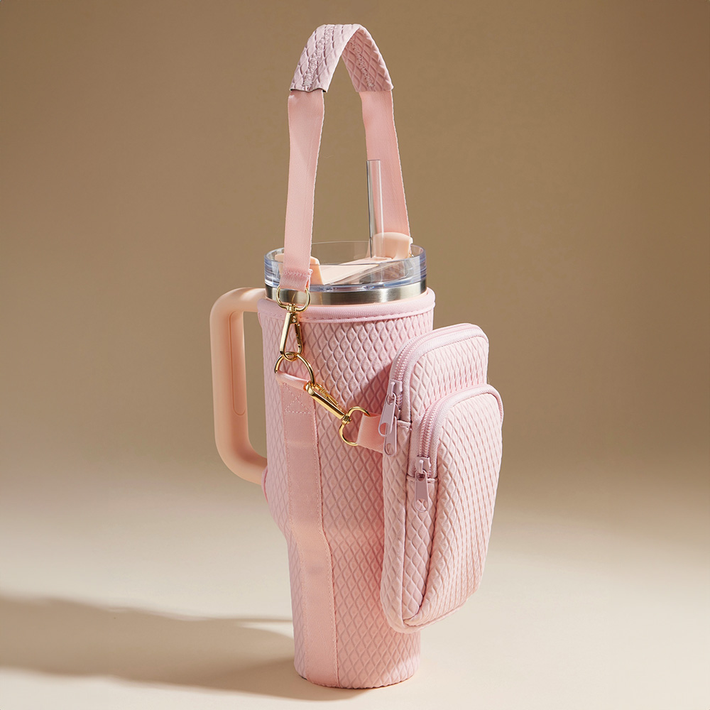 Details • Size : 10" L • Strap Size : Detachable • Two Outside Zipper Pocket Bag Included • Fits Stanley Tumbler 40oz • Material : 100% Neoprene • Strap Material : 100% Polyester • Metal Material : Gold Plated / Zinc and Iron • **Tumbler Not Included**