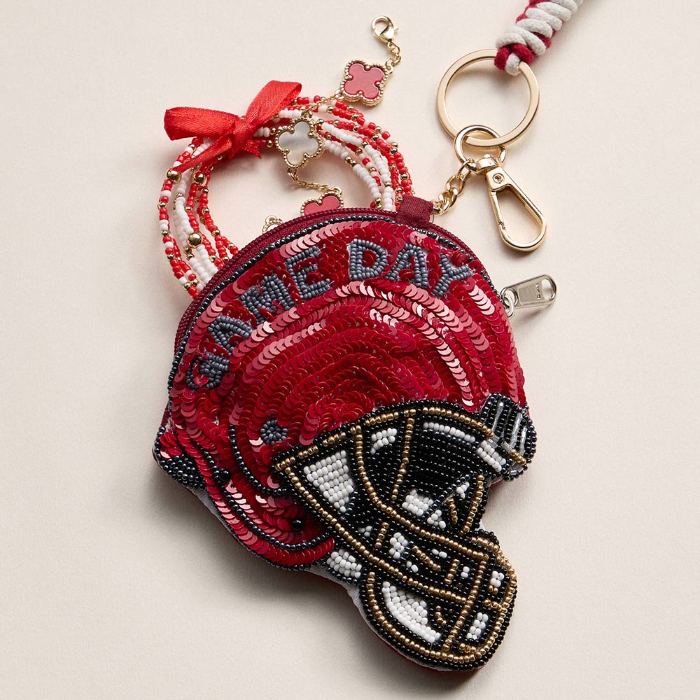 Details • Size : 4.5" X 4.75" (appx) • Decor Size : 9" L • No Inside Pocket • Beads On Front Only • Bag Only (items are not included) • Zipper Closure • Eye-catching helmet-shaped keychain pouch designed with detailed beadwork and zip closure for small essentials. Perfect for game day displays, sports-themed collections, gifting, and impulse buys, this compact accessory adds playful personality while offering practical storage on the go. • Made In India