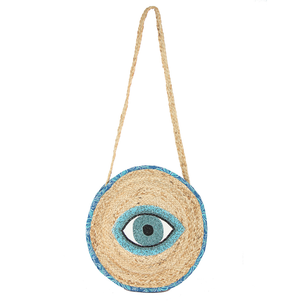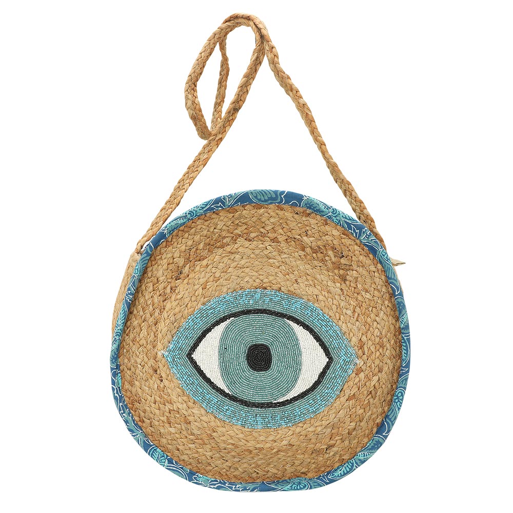 Details • Size : 14" X 15" X 3.75" • Strap Size : 18.5" L • Two Inside Slip Pockets • Zipper Closure • Statement round shoulder bag featuring a bold evil eye motif and structured woven silhouette. Designed to carry daily essentials with ease while adding a playful, protective-inspired accent to any outfit. Ideal for vacations, casual outings, and boutiques seeking eye-catching, trend-driven accessories. • Made In India