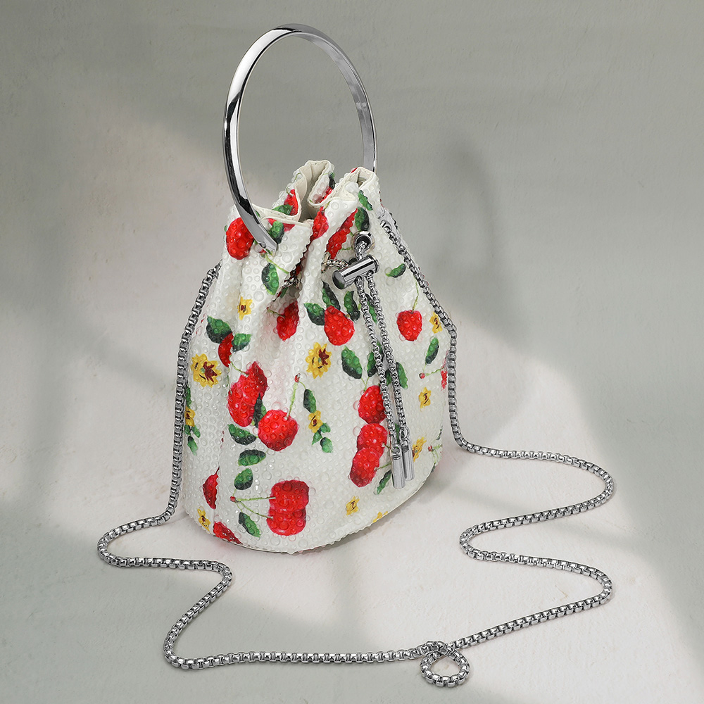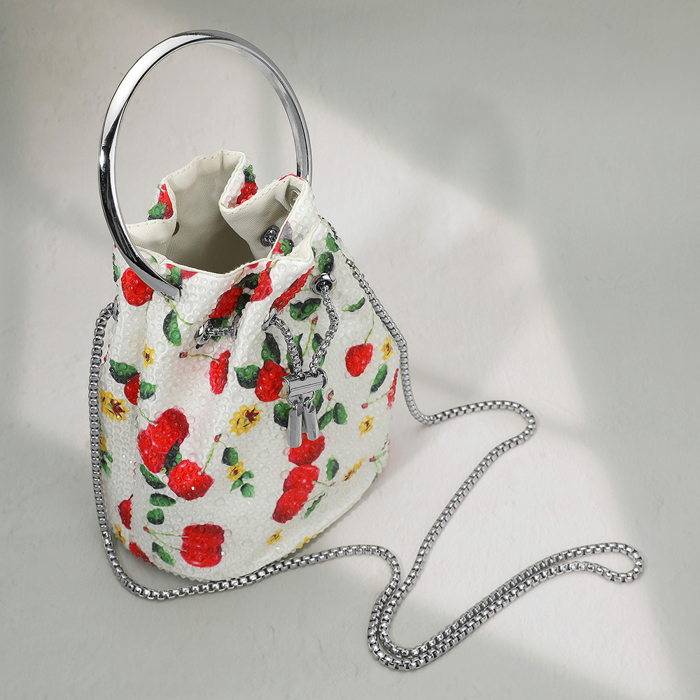 Details • Size : 5.5" X 6.75" X 3.5" • Top Handle Size : 2.75" L • Strap Size : Adjustable • Drawstring Closure • Chic floral pouch with sparkling crystals, round handle, and detachable chain strap. Perfect for weddings, parties, or elegant evenings as a clutch or crossbody.