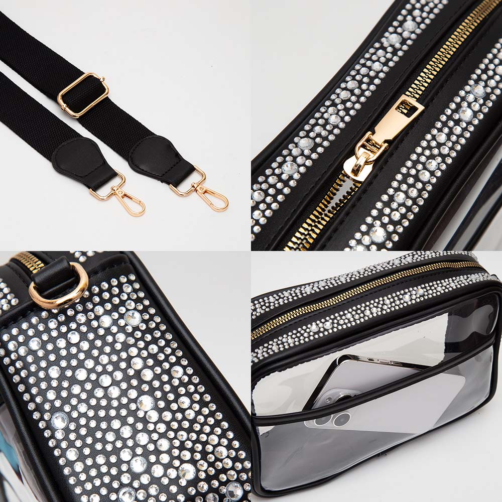 • Elevate your event-ready look with this stylish clear crossbody bag featuring dazzling rhinestone trim, zippered closure, and a wide adjustable strap for comfort. Designed to meet stadium and concert venue requirements while keeping essentials secure and in sight.