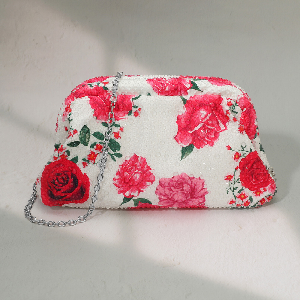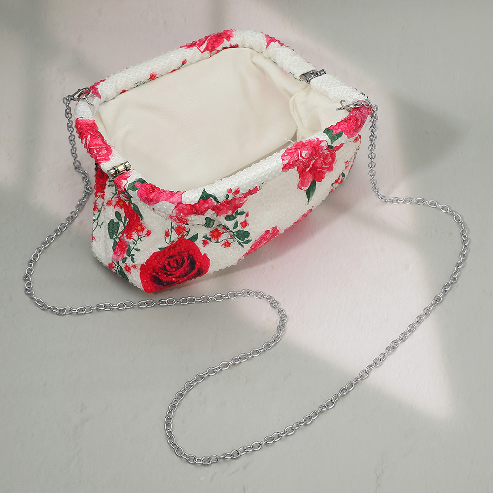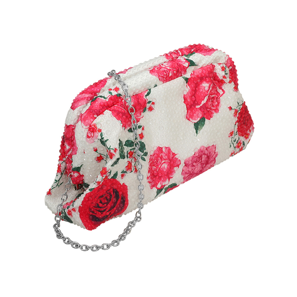 Details • Size : 8.5" X 5" X 2.5" • Strap Size : 47" L Detachable • Add elegance to any outfit with this floral clutch purse featuring vibrant rose prints and a sleek chain strap. Perfect for evening events, weddings, or special occasions, this handbag combines charm and functionality, offering space for essentials while elevating your sophisticated look.