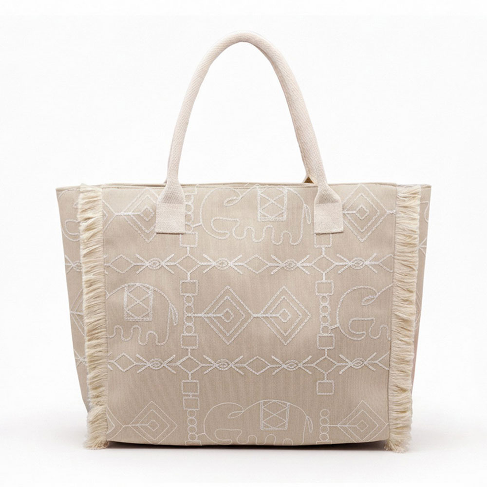Details • Size : 21" X 14.25" X 5" • Inner Pocket • Zipper Closure • Material : 100% Polyester • Stylish everyday tote featuring a spacious interior, sturdy shoulder straps, and decorative fringe trim with an allover elephant patterned design. Ideal for shopping, travel, beach days, or casual outings, offering versatile storage and easy carry appeal for boutique and lifestyle customers.